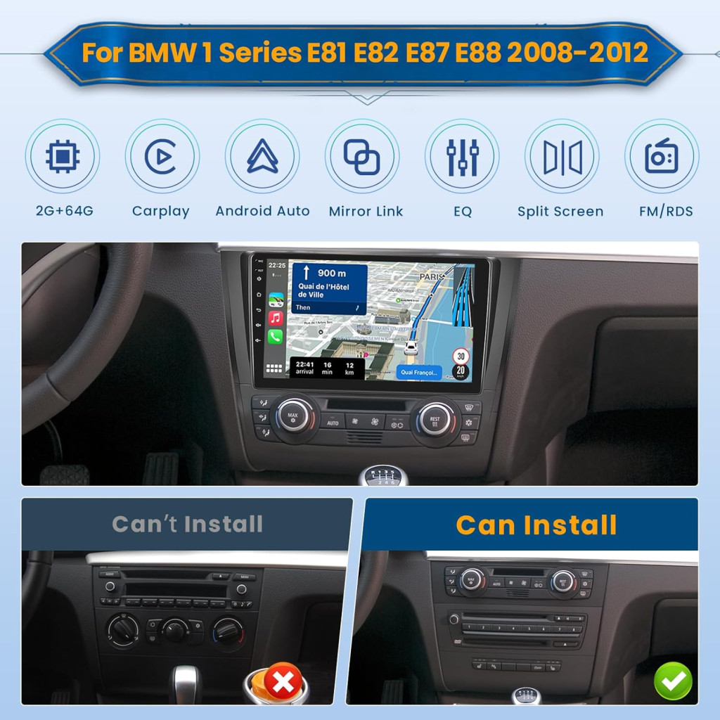 Dispozitivul este pe deplin compatibil cu toate versiunile de BMW Seria 1 E81, E82, E87 și E88 (2008-2012). Pachetul include un decodor CAN-BUS, care asigură o integrare fără probleme cu sistemele originale ale mașinii. Dacă mașina este echipată cu cablu optic, poate fi necesar un decodor de fibră optică pentru redarea audio.