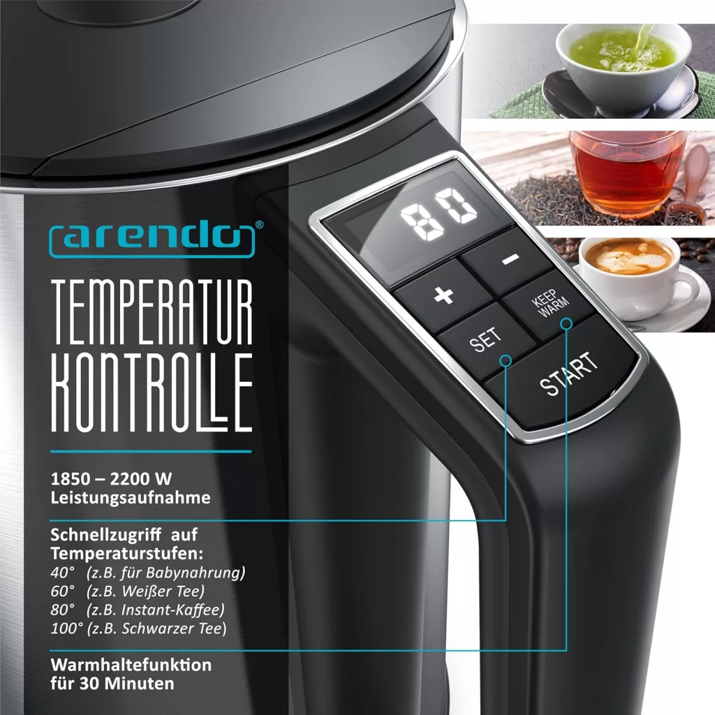 Az Arendo rozsdamentes vízforraló precíz hőmérséklet-szabályozással: