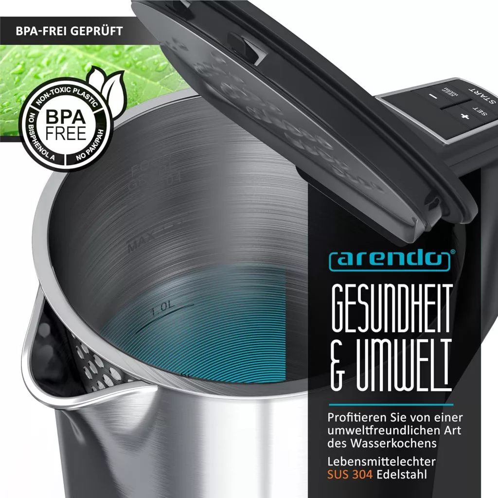 A termék BPA-mentes, nem bocsát ki mikroplasztik részecskéket, így különösen környezet- és egészségbarát. Az Arendo Elegant belső burkolata élelmiszer-biztonságú SUS/SAE304 rozsdamentes acélból készült, amely garantálja a tartósságot és a higiéniát. A dupla falú kialakítás biztosítja, hogy a külső felület csak a forralás során melegszik fel, így biztonságos a kezelése még gyermekek közelében is.