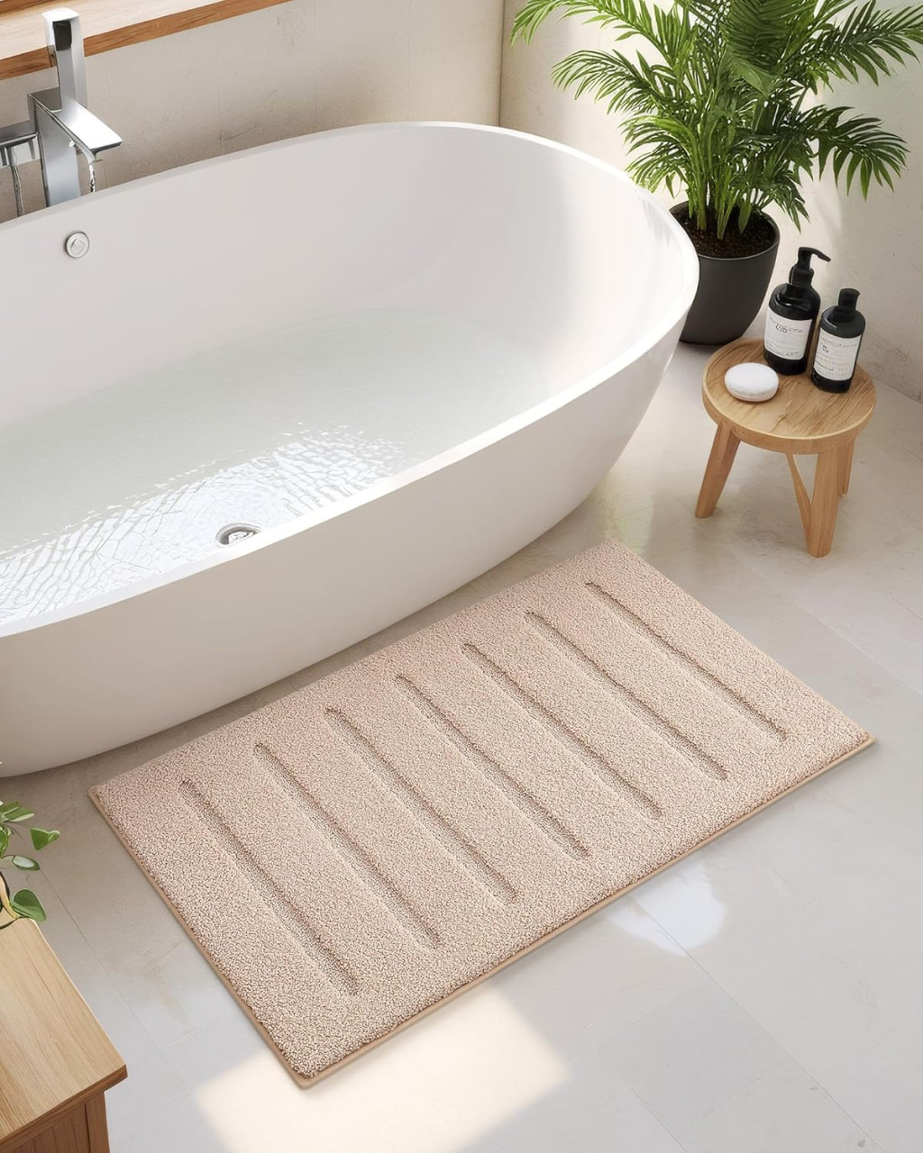 Covorașul de baie COLOR&GEOMETRY este versatil și poate fi utilizat în întreaga locuință. Este o alegere ideală pentru a fi așezat în fața căzii, unde picăturile de apă sunt absorbite rapid. Este o soluție perfectă și în fața dușului, unde stratul inferior antiderapant asigură siguranța. Covorașul funcționează excelent și în fața chiuvetei, unde se acumulează apă în timpul utilizării zilnice. În plus, poate fi folosit în spălătorie sau în alte încăperi umede, unde este nevoie de un covoraș absorbant și antiderapant. Datorită culorii bej elegante și a modelului cu dungi 3D, acesta funcționează și ca un element decorativ, care îmbunătățește aspectul băii.