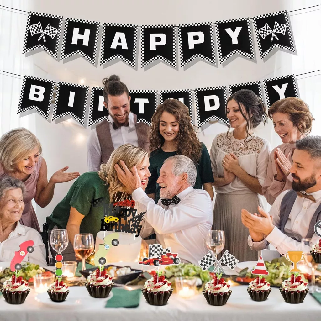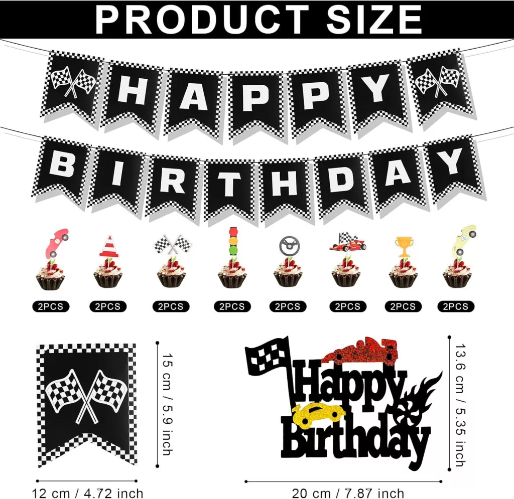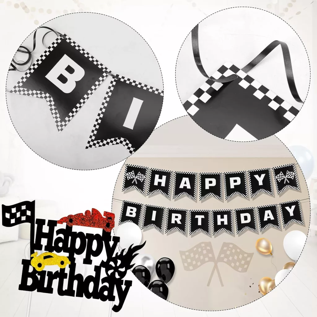 Banner Happy Birthday cu model în carouri și tematică mașini de curse - Decorațiuni Aniversare Banner Happy Birthday cu model în carouri și tematică mașini de curse