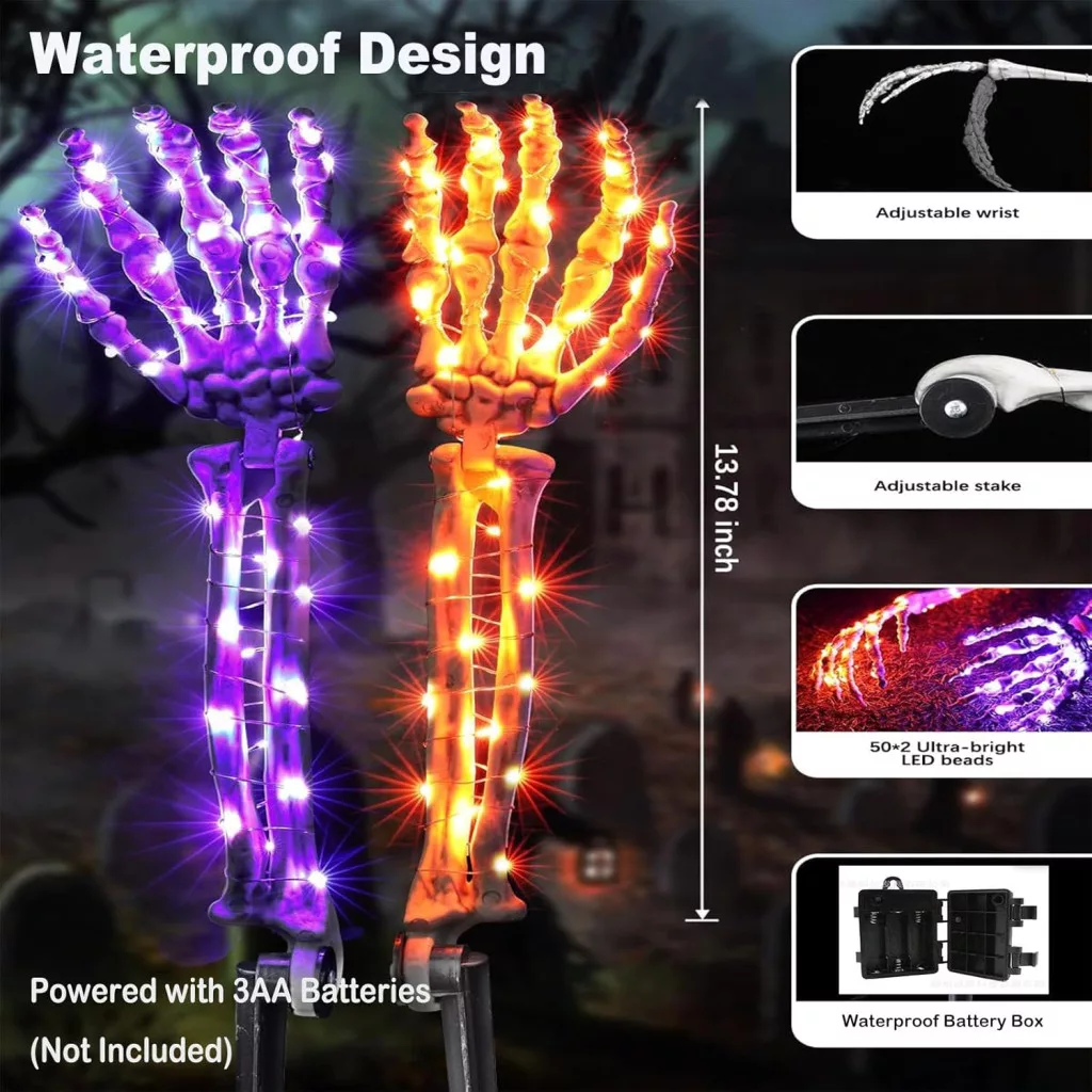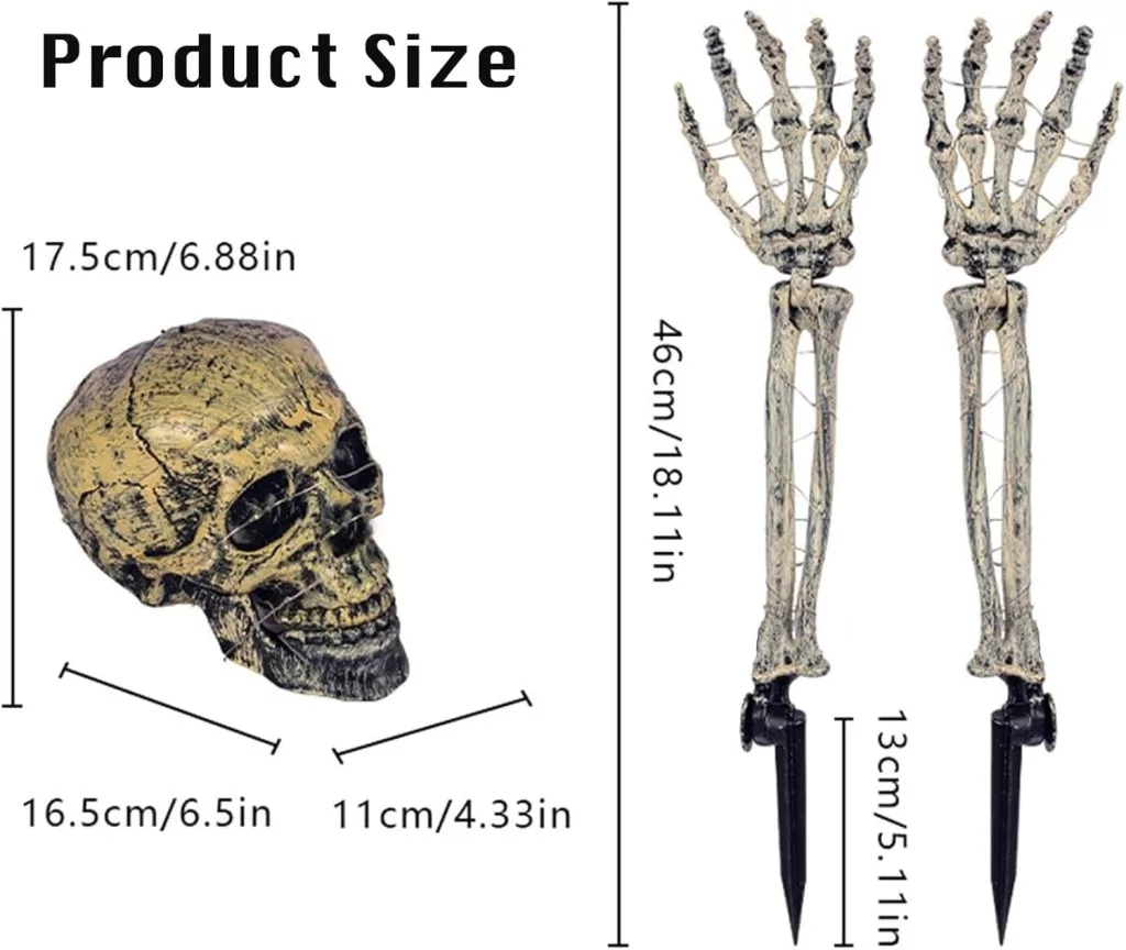 Decorațiunile de grădină Kmljoee cu schelet pentru Halloween reprezintă o soluție de calitate profesională, care atrage garantat atenția prin aspectul realist și efectul înfricoșător. Setul este format dintr-un craniu și 2 mâini osoase, creând o scenă tip zombie, ca și cum morții ar ieși din mormânt.