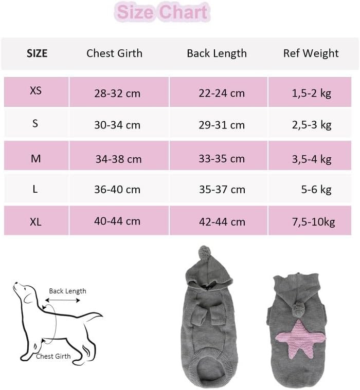 Acest pulover adorabil pentru câini este alegerea perfectă pentru orice câine mic care dorește să se plimbe cu stil și căldură în zilele mai reci. Puloverul cu glugă, de culoare gri deschis, nu numai că oferă protecție practică împotriva intemperiilor, dar este și un accesoriu la modă. Fabricat din material acrilic elastic, puloverul este ideal pentru câinii cu greutatea între 1,5 și 10 kilograme, fie că este vorba de un chihuahua, un câine maltez sau un pudel pitic.