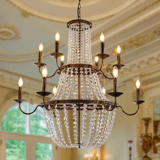 Candelabrul cu cristale TOCHIC este o piesă de lux autentică, care combină trăsăturile elegante ale stilului Imperiul Francez cu finisajul din bronz antic. Această lampă suspendată uimitoare, cu 12 brațe, este decorată cu sute de mărgele de cristal strălucitoare, care sunt agățate pe trei inele de dimensiuni diferite. Rezultatul este o soluție de iluminat care nu este doar funcțională, ci și un adevărat obiect de decor în casă.