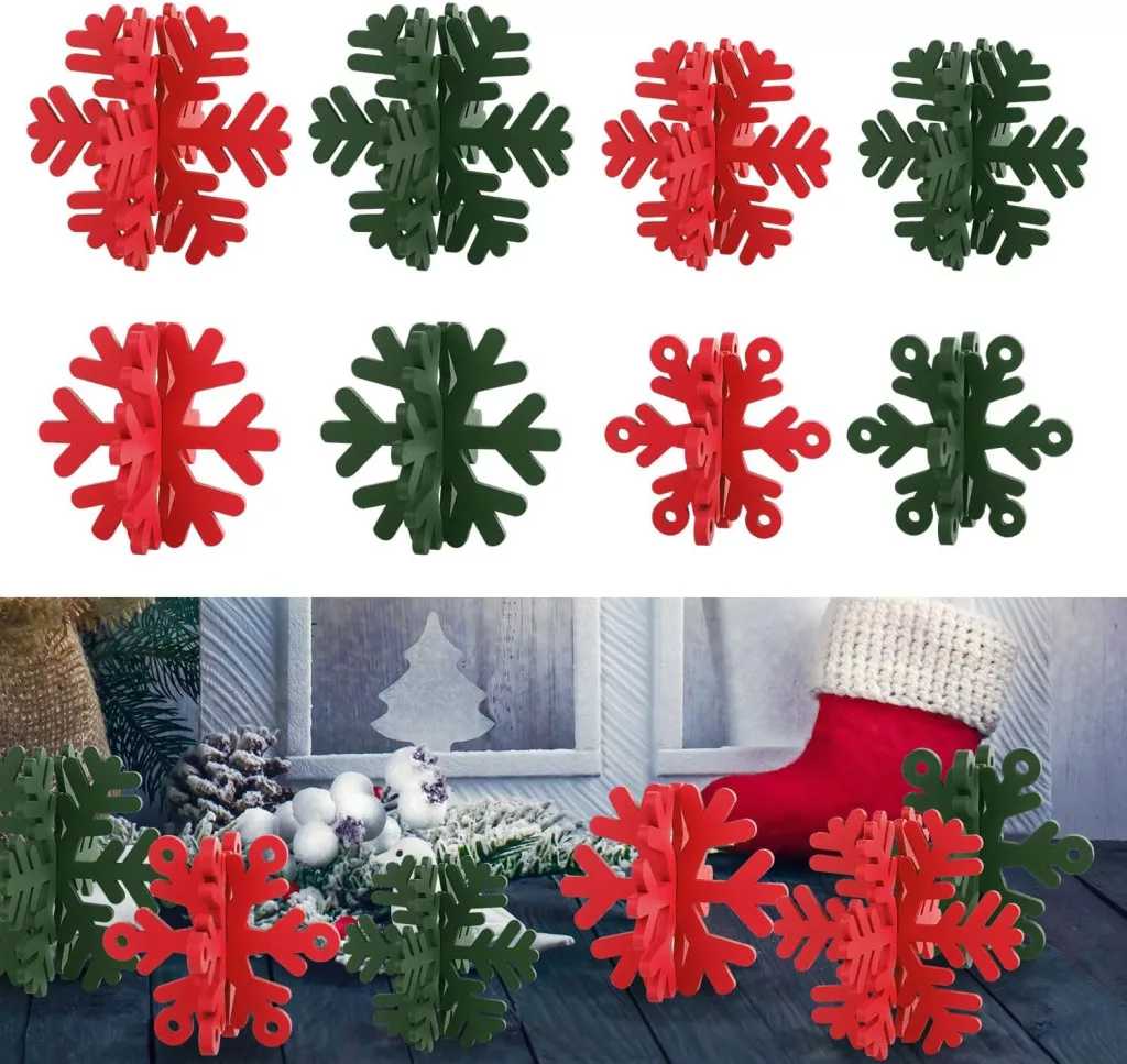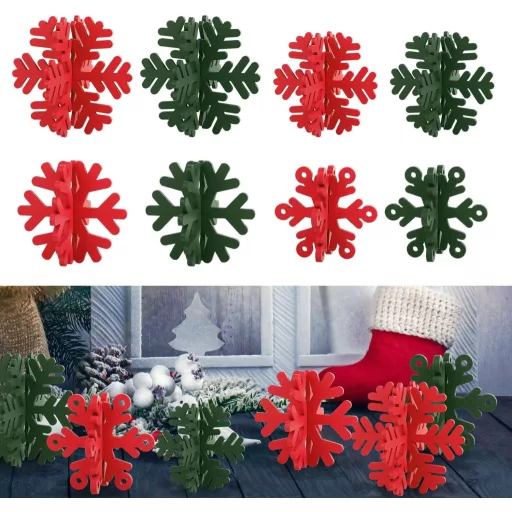 Setul vine în culorile verde și roșu, creând o atmosferă clasică de Crăciun. Fiecare fulg de zăpadă este format din două piese de aceeași dimensiune, care trebuie doar asamblate pentru a obține o decorațiune stabilă, în formă 3D. Va sta cu siguranță pe masă sau pe alte suprafețe, nu se va clătina și va pregăti imediat mediul pentru sărbătoare.