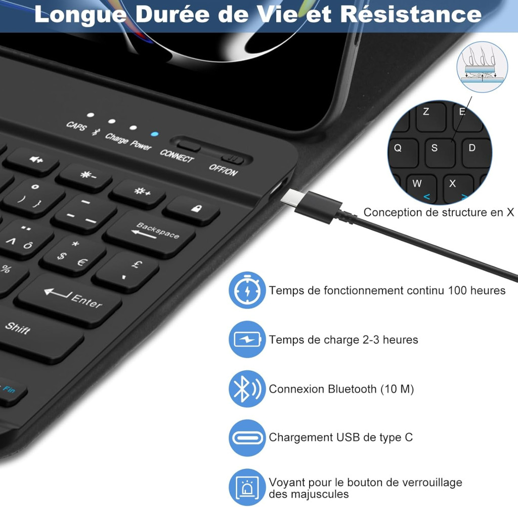 • Tastatură Bluetooth Detașabilă: Tastatura wireless ultra-subțire se conectează la husă cu fixare magnetică, astfel încât poate fi detașată cu ușurință oricând. Rămâne stabilă în timpul călătoriei și nu cade accidental.