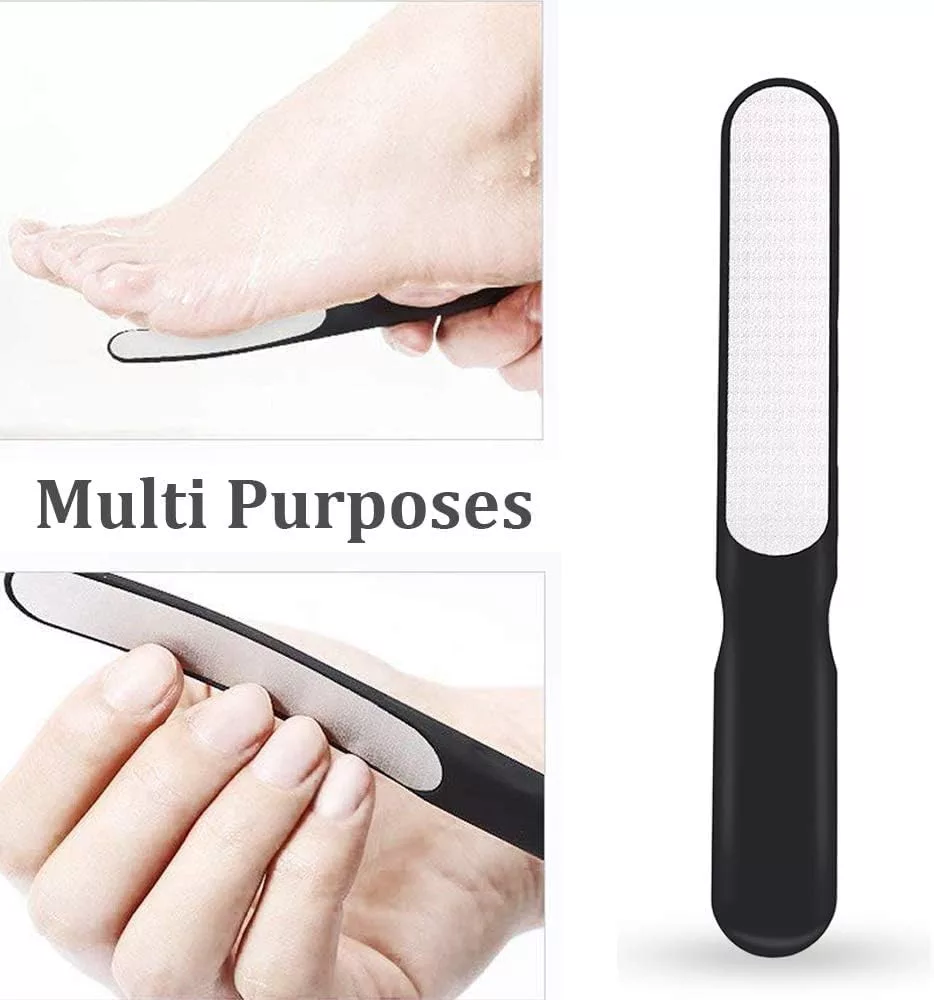 Setul de îngrijire a picioarelor KLADNDER este universal utilizabil, indiferent de dimensiunea sau tipul piciorului. Setul include tot ce este necesar pentru o îngrijire completă a picioarelor. Materialul din oțel inoxidabil garantează o durată lungă de viață și o utilizare igienică. Designul față-verso vă permite să alegeți între diferite grade de rugozitate, astfel încât să puteți găsi partea potrivită pentru fiecare afecțiune a piciorului. Dimensiunile setului sunt: 27,4 x 7,8 x 2,4 cm, greutatea: 110 g, ceea ce este ideal pentru portabilitate.