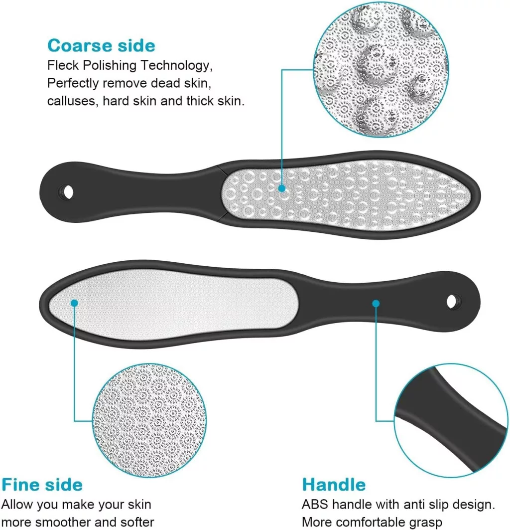 Pentru a asigura o durată lungă de viață a setului, se recomandă curățarea regulată. După utilizare, pur și simplu clătiți cu apă caldă și uscați. Se recomandă o curățare mai amănunțită o dată pe săptămână, de exemplu cu apă și săpun. Setul trebuie depozitat într-un loc uscat pentru a preveni ruginirea. În timpul îngrijirii picioarelor, începeți cu gradul de rugozitate mai ușor, apoi treceți la unul mai puternic, dacă este necesar. De obicei, un tratament de 1-2 ori pe săptămână este suficient pentru a menține picioarele într-o stare sănătoasă.