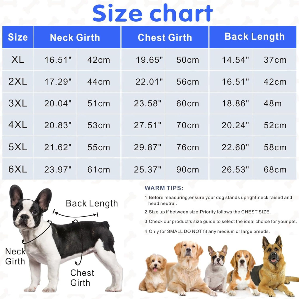 Este important de reținut că, pentru a alege mărimea potrivită, trebuie să măsurați circumferința gâtului, circumferința pieptului și lungimea spatelui câinelui dumneavoastră înainte de a cumpăra. Nu alegeți în funcție de mărimea obișnuită, deoarece dimensiunile diferiților producători pot varia, iar constituția fizică a câinilor poate varia semnificativ chiar și în cadrul aceleiași rase.