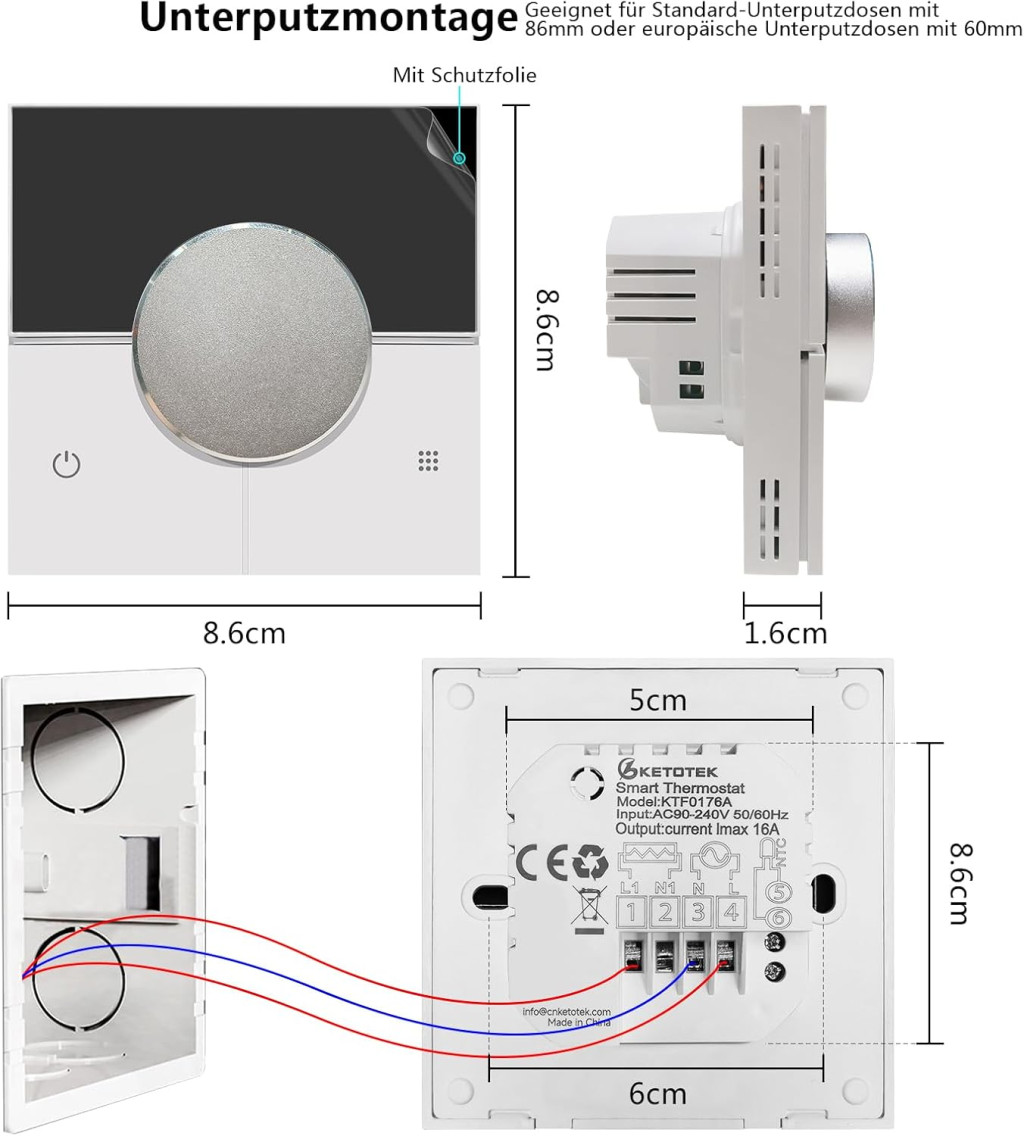 KETOTEK Smart Electric Heating Thermostat este o soluție inteligentă pentru reglarea automată a încălzirii electrice în pardoseală. Acest termostat de 16A se conectează la internet prin WiFi, permițând integrarea în sistemele de tip smart home și controlul prin aplicația mobilă. Dispozitivul vine cu dimensiuni de 86x86x17 mm, într-un design încastrat în perete, și funcționează la o tensiune de AC 90-240V 50/60Hz.