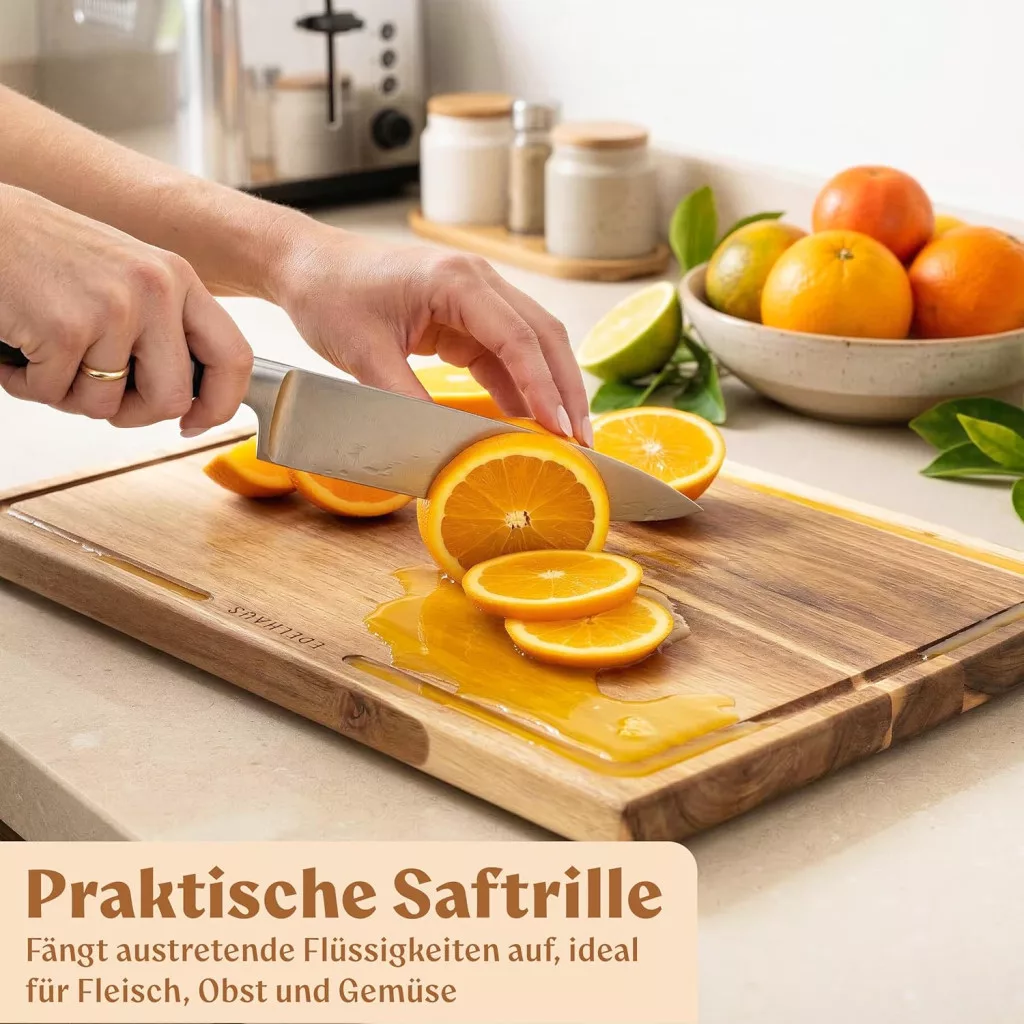 Fiecare fund de tăiere are o grosime de 2 cm, ceea ce asigură stabilitatea necesară și o durată de viață lungă. Materialul din lemn natural de salcâm nu este doar funcțional, ci aduce și o notă estetică bucătăriei. Datorită modelului unic al lemnului, fiecare piesă este unică, devenind un accesoriu personalizat pentru spațiul dumneavoastră de lucru în bucătărie.