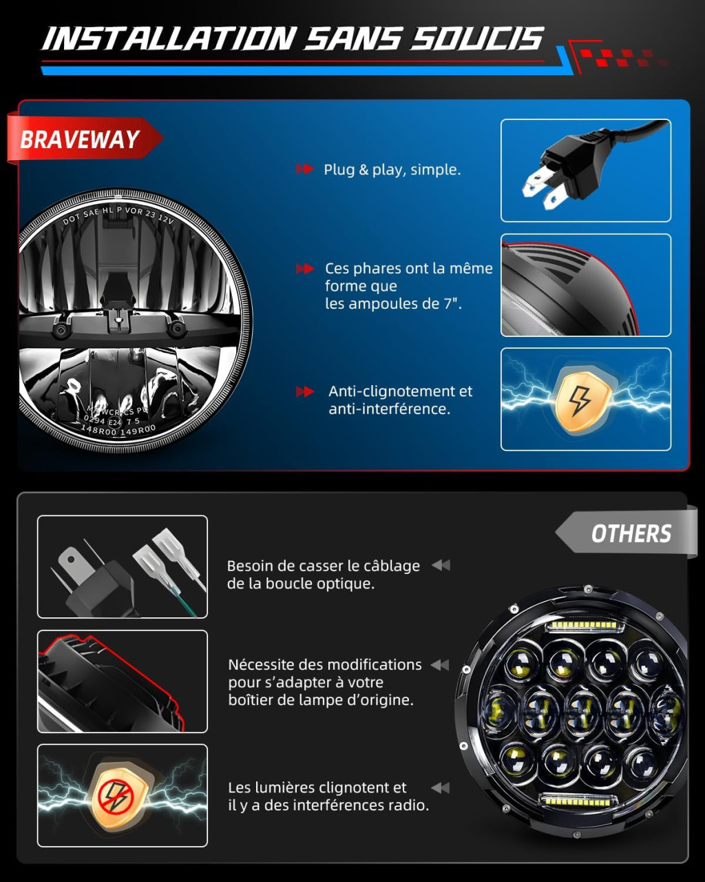 În general, farul LED BraveWAY de 7 inch pentru motocicletă este o investiție excelentă care nu numai că sporește siguranța, ci și conferă vehiculului dumneavoastră un aspect elegant. Datorită instalării plug and play, vă puteți bucura de avantajele noului far super luminos în câteva minute, fie că este vorba de trafic urban, de excursii lungi sau de aventuri off-road.