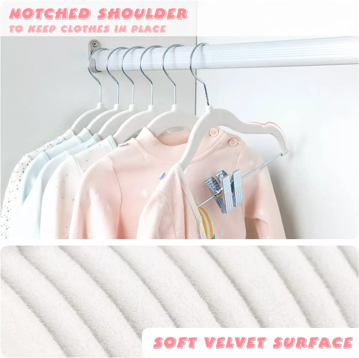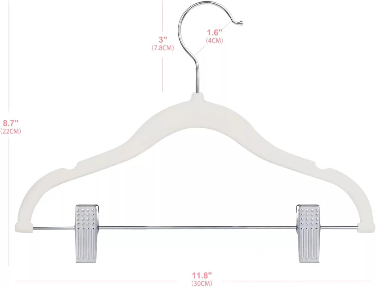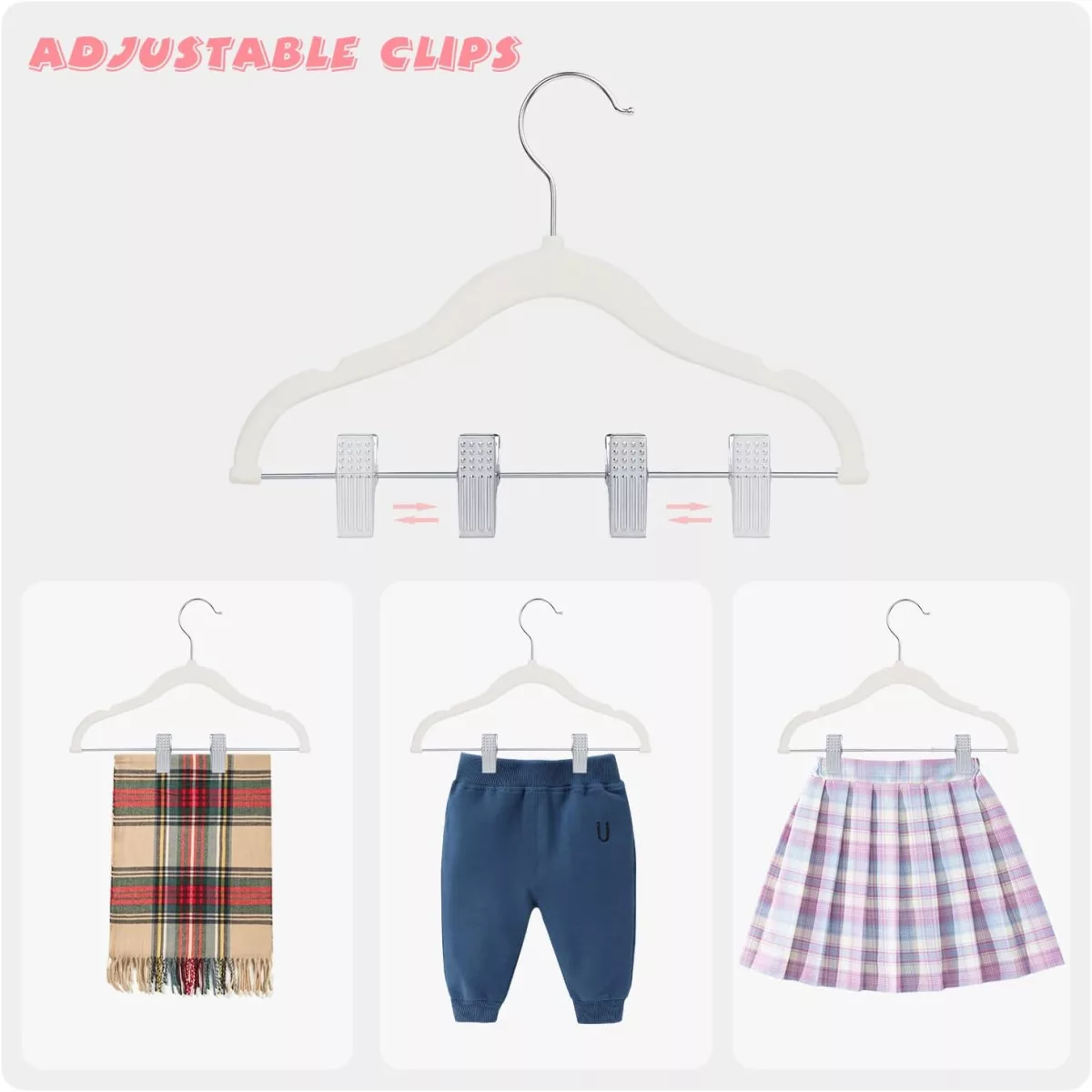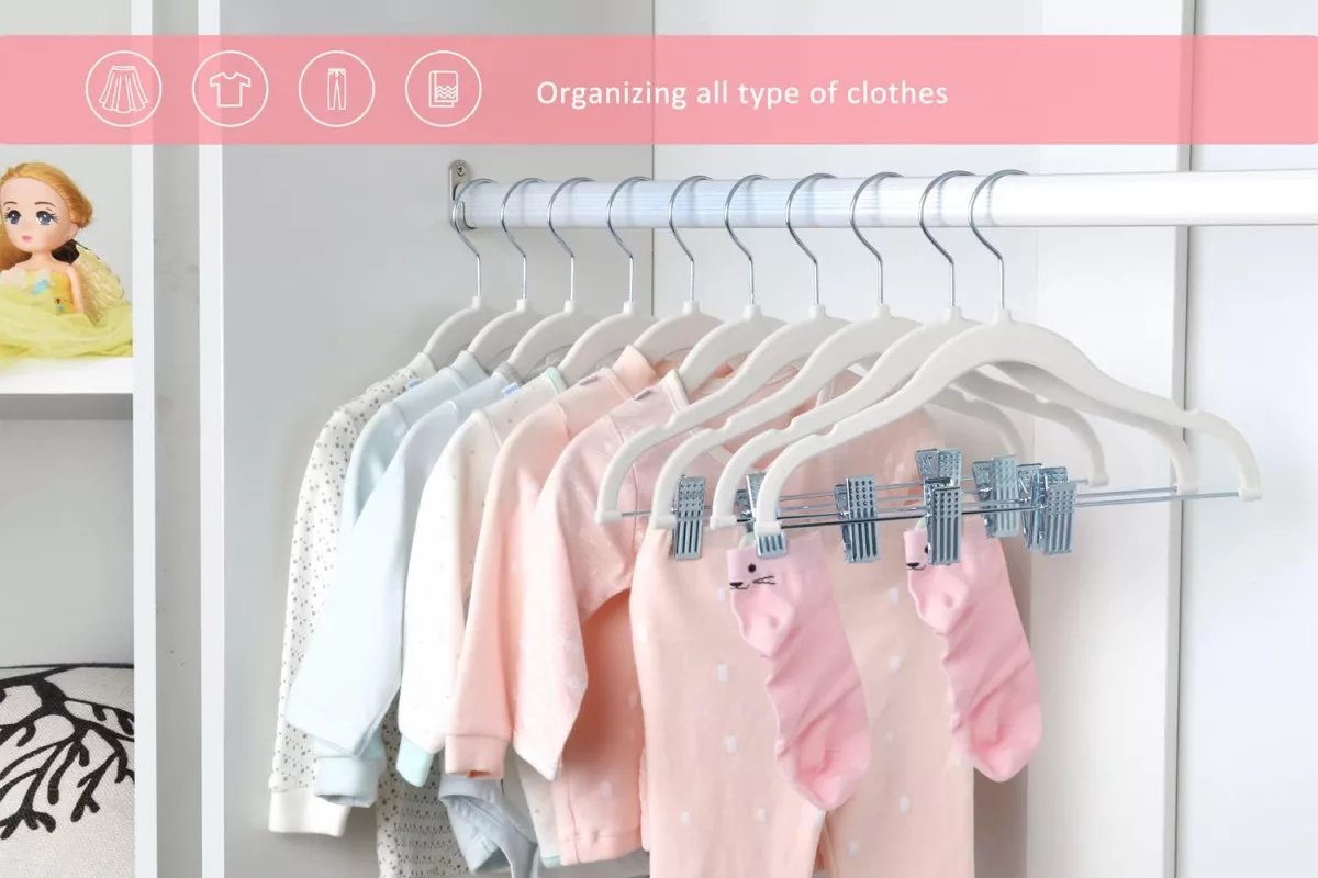 - Clipsuri mobile: Cele două clipsuri metalice pot fi mutate și înclinate liber, la o distanță de până la 10,5 inchi. Acest lucru permite ca umerașul să se adapteze la hainele de diferite dimensiuni, astfel încât nu este nevoie să cumpărați umerașe noi pe măsură ce copilul crește.