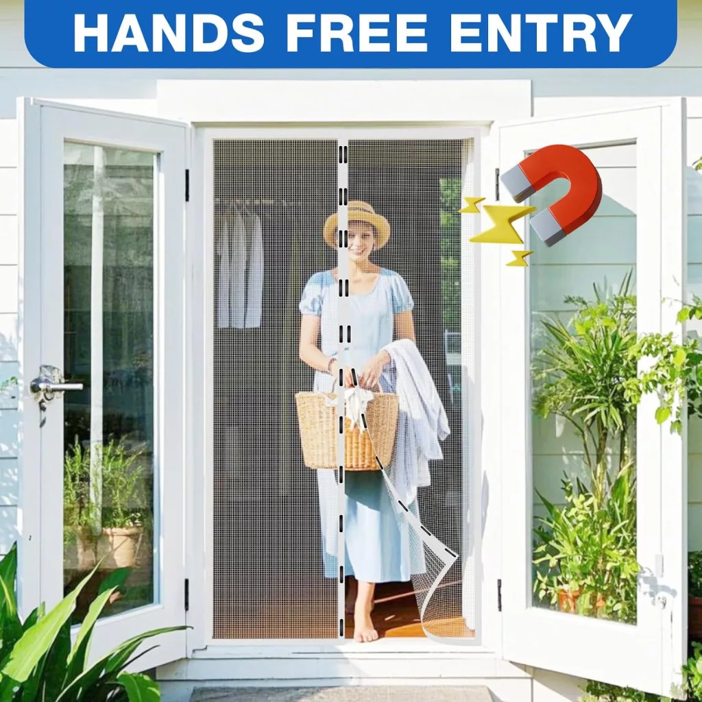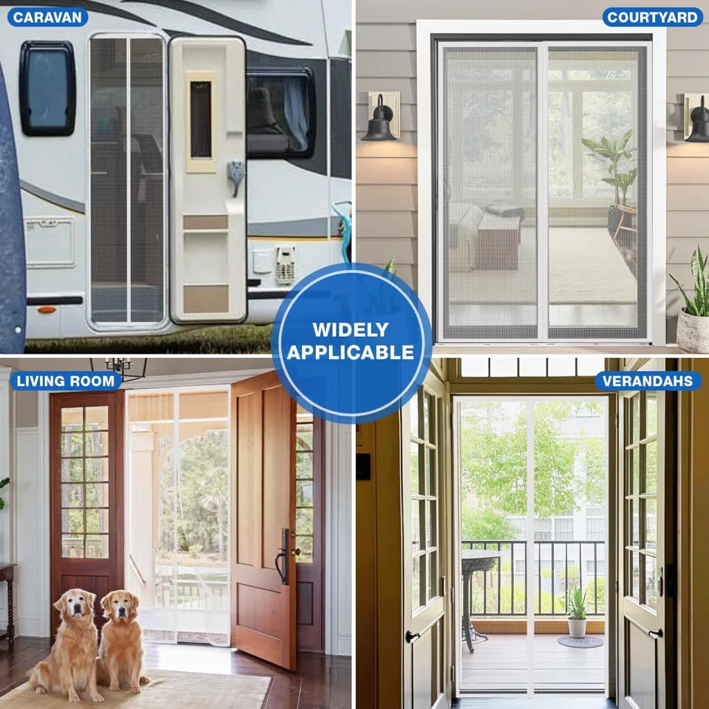 • Este potrivită pentru animalele de companie? Da, absolut! Sistemul magnetic puternic asigură că plasa se închide automat, chiar și atunci când câinii sau pisicile trec prin ușă. Materialul este, de asemenea, rezistent la eventualele zgârieturi.