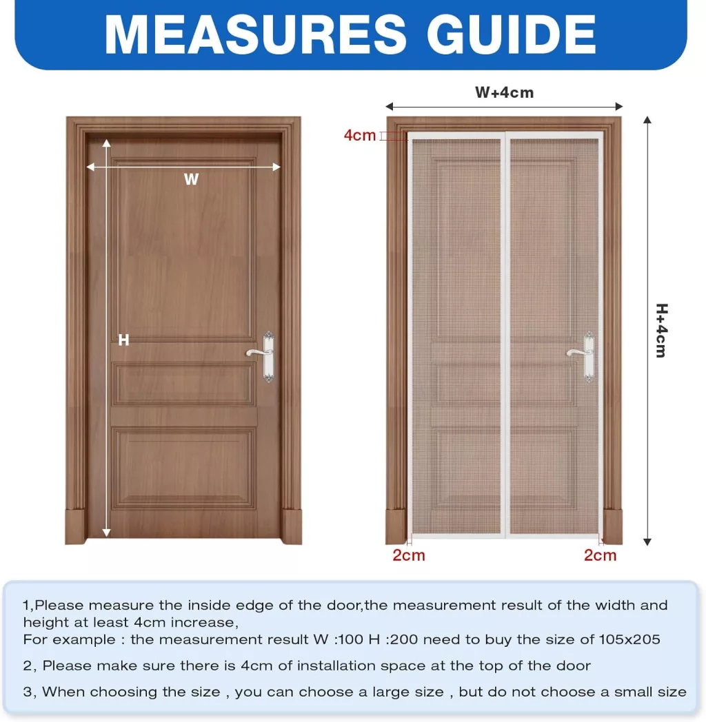 Plasa anti-insecte de 150 x 240 cm se potrivește cadrelor de ușă cu dimensiuni interioare de maximum 146 x 236 cm. Este important să măsurați cu precizie dimensiunile interioare ale cadrului ușii și să lăsați o marjă de cel puțin 4 cm. Plasa nu poate fi tăiată la dimensiune, deci dacă ușa este mai mare decât dimensiunea specificată, vă recomandăm să alegeți o variantă mai mare. Banda autoadezivă cu arici poate fi aplicată pe suprafețe netede (lemn, plastic, metal).