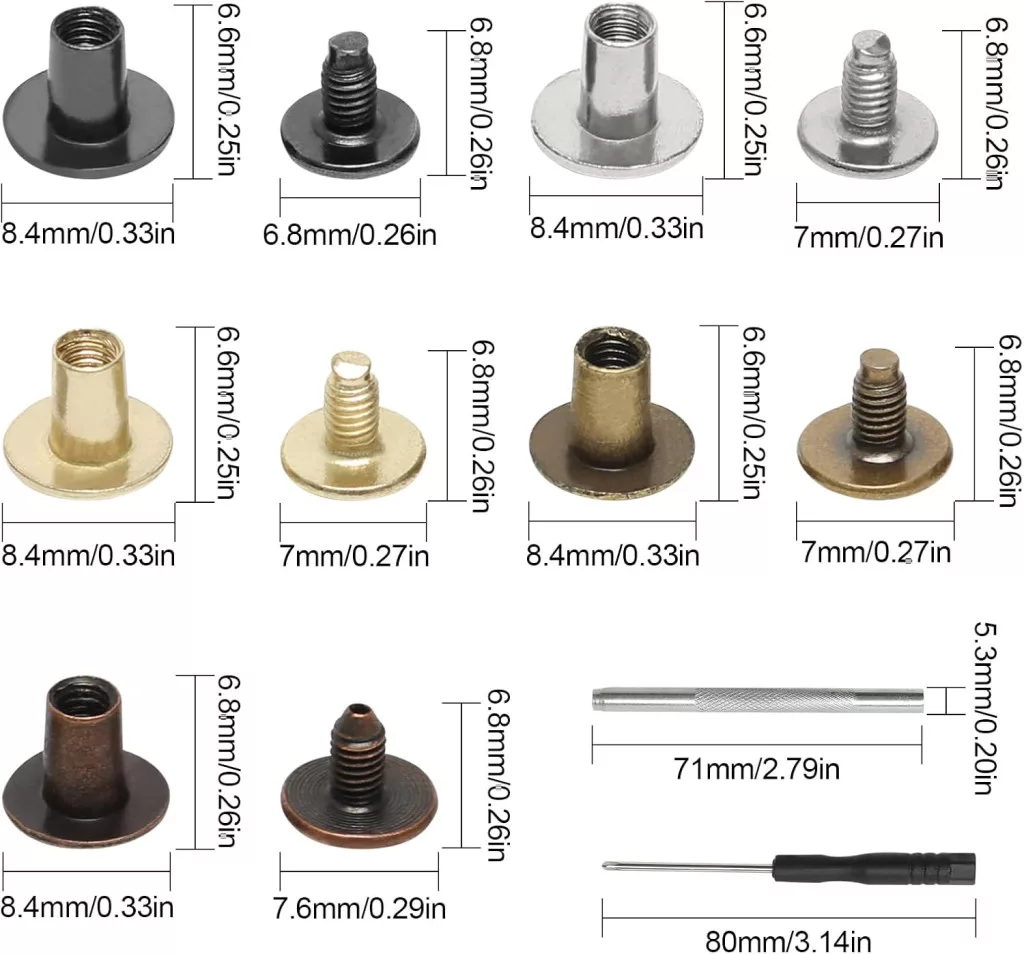 Descoperiți lumea proiectelor creative cu acest set versatil de 150 de șuruburi Chicago! Pachetul include 150 de seturi de șuruburi de legătură M5 x 6/8 mm în cinci culori diferite (argintiu, auriu, bronz, negru-metal și bronz roșu), precum și un perforator practic și o șurubelniță în cruce. Acest set oferă o soluție perfectă pentru prelucrarea pielii, legătorie, realizarea de albume foto, confecționarea de genți, curele și alte proiecte DIY.