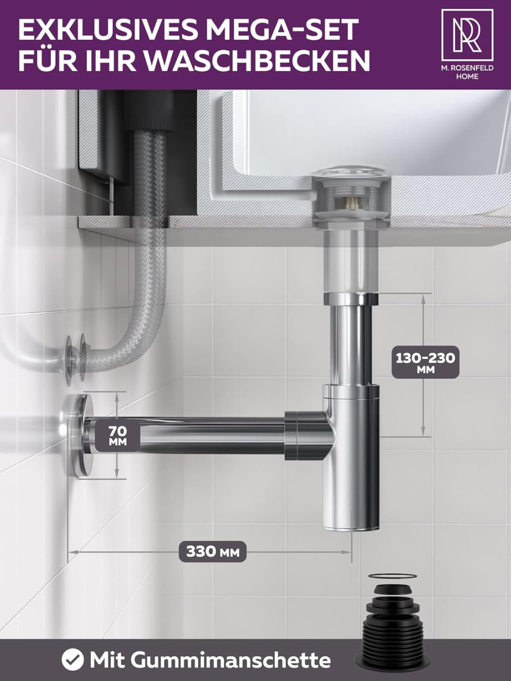 Important: Înainte de a cumpăra, măsurați înălțimea vechiului dumneavoastră sifon sau distanța dintre canal și racordul de perete. Dacă există o discrepanță la chiuveta dumneavoastră, în magazinul M. ROSENFELD HOME sunt disponibile și alte modele de sifon care se potrivesc mai bine nevoilor dumneavoastră.