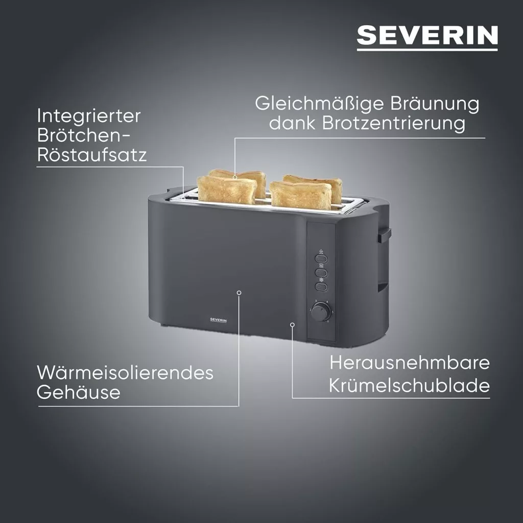 Az elegáns matt fekete design modern és időtlen, amely bármely konyhabútor stílusához illeszkedik. A Severin márka hosszú évek óta ismert a minőségéről és megbízhatóságáról, így ez a termék egy olyan beruházás, amely évekig szolgálja majd a családot. Az eltávolítható morzsatálca és az egyszerű kezelés a napi használatot könnyűvé és kellemesvé teszi.