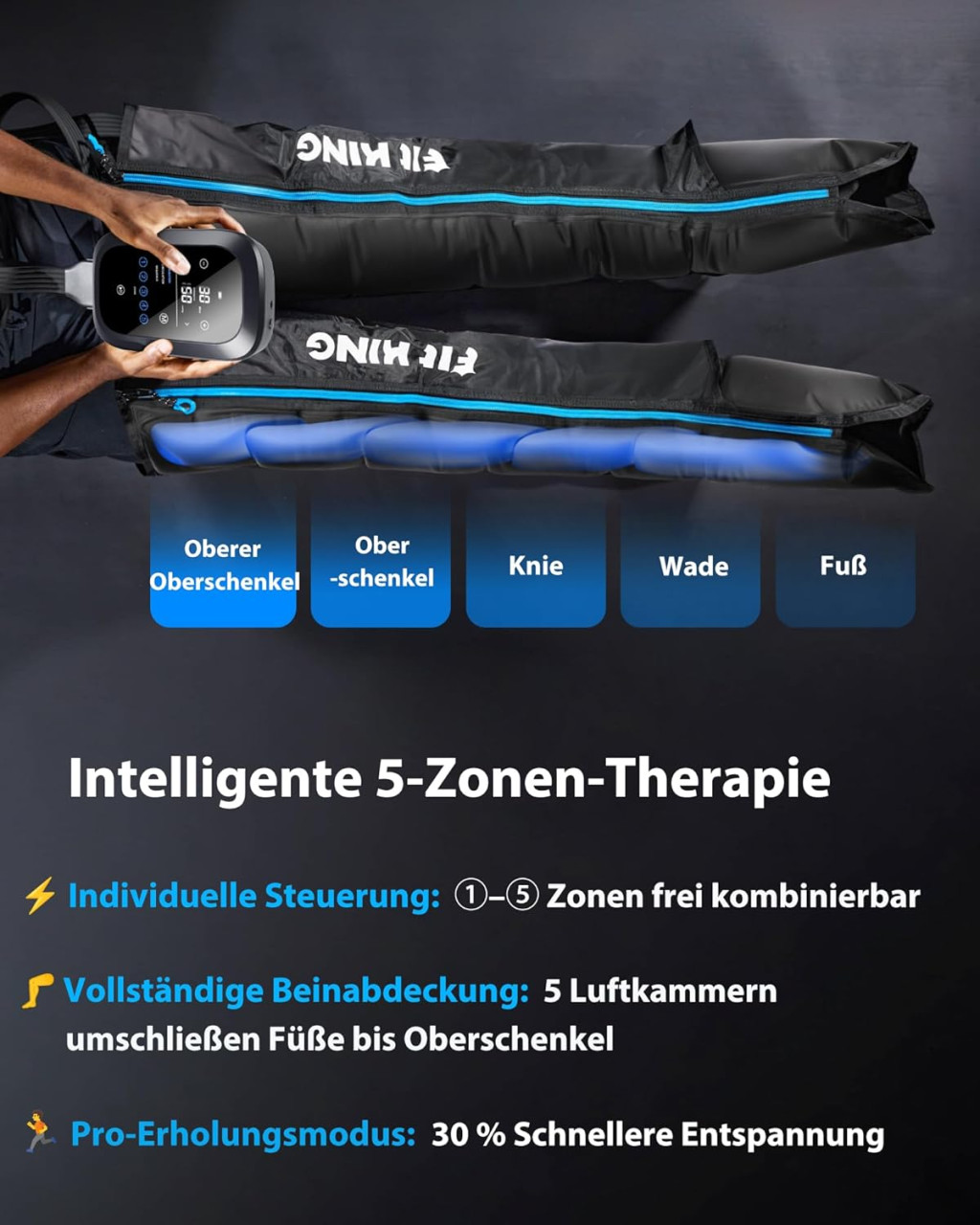 Cizmele de compresie pentru masajul picioarelor FIT KING Wireless reprezintă un dispozitiv profesional care aplică metode dovedite științific pentru regenerarea picioarelor și a gambelor. Combinația dintre presiunea pneumatică dinamică la 360°, cele 11 niveluri de intensitate și cele 3 programe de masaj permite un tratament personalizat pentru orice utilizator. Dispozitivul este ideal pentru sportivi, persoane care lucrează la birou și pentru oricine suferă de dureri de picioare sau circulație periferică deficitară.