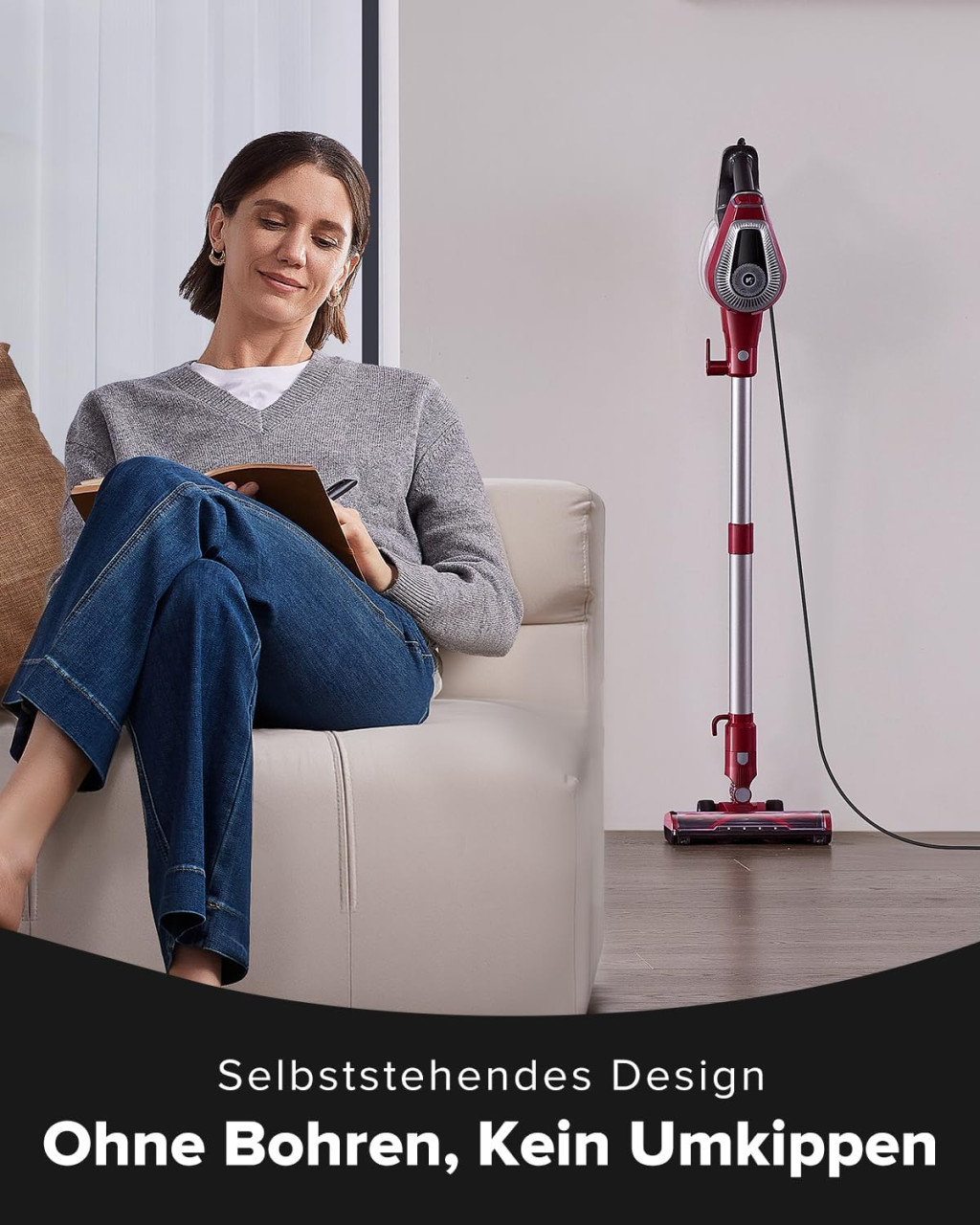 A vezetékes tápellátás biztosítja a folyamatos, stabil teljesítményt, ellentétben az akkumulátoros porszívókkal, amelyek idővel veszítenek szívóerejükből. A 220 V-os elektromos csatlakozás és a 7 méteres kábel ideális nagyobb lakások, villák, irodák és üzletek számára. Az önálló állványzat lehetővé teszi, hogy a porszívót bármikor függőlegesen elhelyezze, anélkül hogy falnak kellene támasztania.