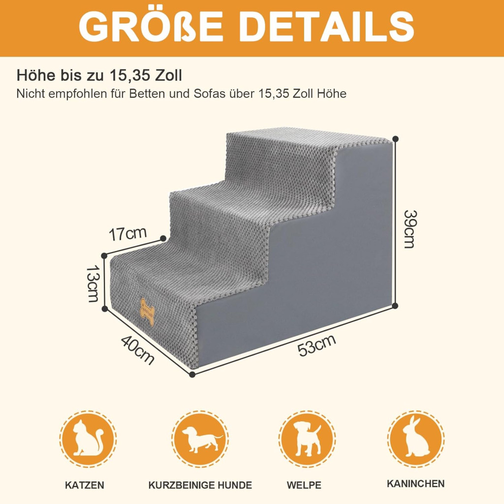 A lépcsők mérete ideális a legtöbb ágy és kanapé magasságához. Vásárlás előtt javasoljuk, hogy mérje meg, milyen magasságra kell a kutyádnak felkapaszkodnia. A termék vákuumcsomagolásban érkezik, és a szivacs teljes kibontásához körülbelül 24 órára van szükség.