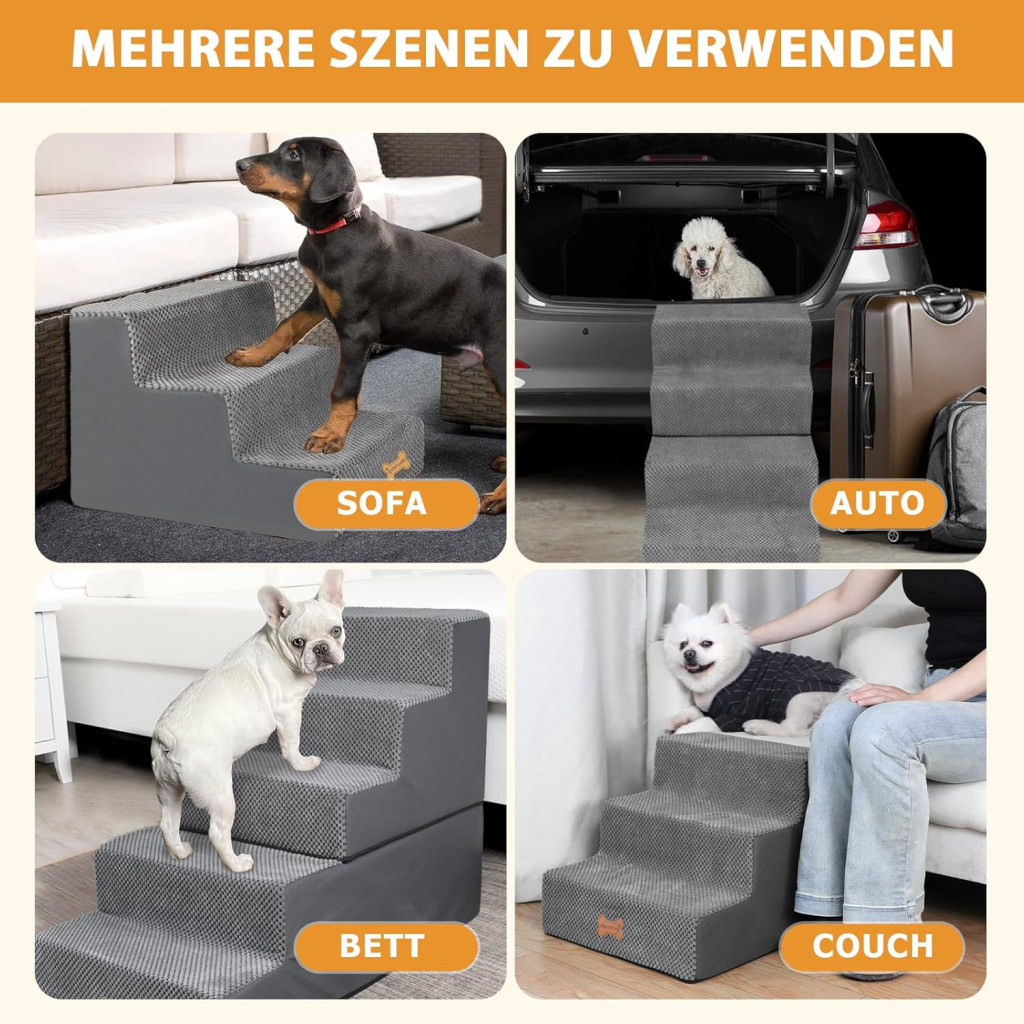 Ezek a kutyalépcsők kifejezetten arra tervezték, hogy csökkentsék az ízületi terhelést, megelőzzék a sérüléseket és javítsák az idősebb vagy mozgáskorlátozottan élő kutyák életminőségét. A magas sűrűségű szivacs és a csúszásmentes felület garantálja a biztonságot és a stabilitást minden használat során.