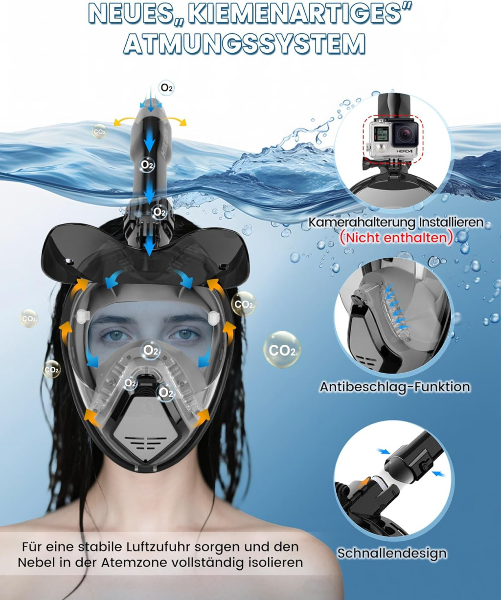 Masca de snorkeling pentru adulți BOOSTEADY este un dispozitiv revoluționar de scufundare, care combină tehnologia modernă pentru confortul și siguranța utilizatorului. Această mască integrală este special concepută pentru cei care doresc să maximizeze experiența subacvatică, menținând în același timp o vedere clară și confortul. Protecția solară integrată și funcția de vorbire fac din această mască o alegere unică pe piață.