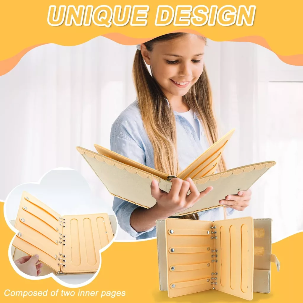 - Design Unic: Are două pagini interioare care pot stoca numeroase tipuri de accesorii de păr. Puteți personaliza coperta după bunul plac, ca un plan de dosar cu foi detașabile, pe care să-l răsfoiți ca pe o carte.