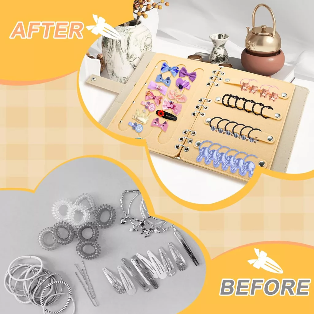 Acest organizator de înaltă calitate pentru accesorii de păr este soluția perfectă pentru depozitarea ordonată a accesoriilor de păr ale fetelor. Designul unic, tip carte, vă permite să răsfoiți cu ușurință toate elasticele de păr, bentițele și alte accesorii, ca și cum ați privi o carte de decor frumoasă. Fabricat din material textil tip fetru premium, acest organizator nu este doar practic, ci și un element de decor pentru cameră, ajutând copiii să își formeze obiceiuri bune de depozitare.