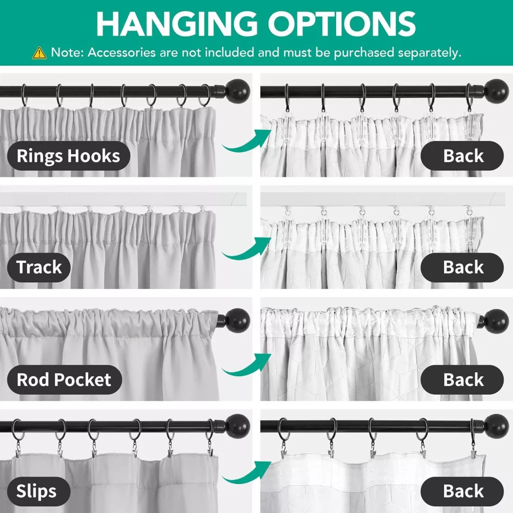 Sistemul de bandă superior al perdelei este compatibil cu majoritatea șinelor și barelor de perdea standard. Cârligele nu sunt incluse în pachet, astfel încât sunteți liber să alegeți tipul care vi se potrivește cel mai bine - fie că este vorba de cârlige S, cârlige C sau orice altă metodă de fixare compatibilă. Această flexibilitate permite perdelei să se potrivească perfect cu interiorul existent.