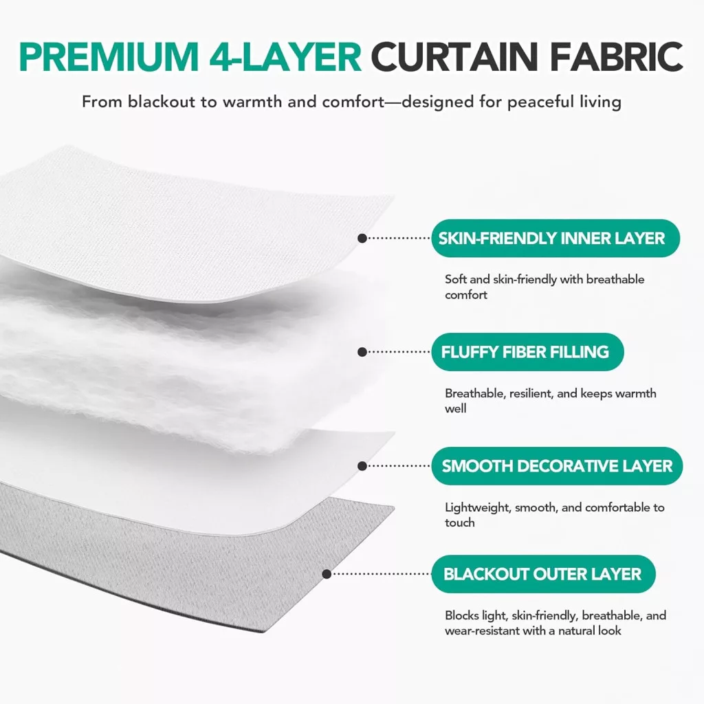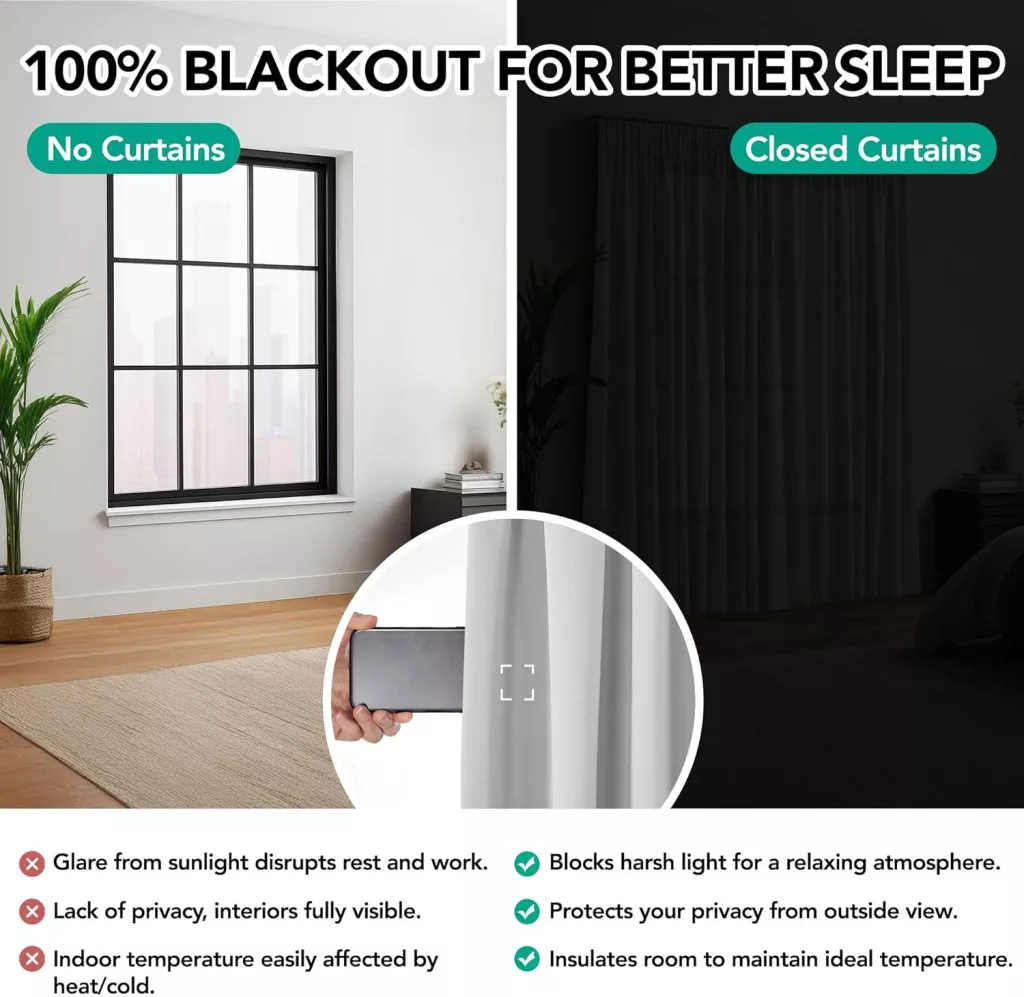 - Efect opacizant: Materialul gros cu căptușeală interioară întunecată reduce eficient lumina exterioară și vă protejează intimitatea
