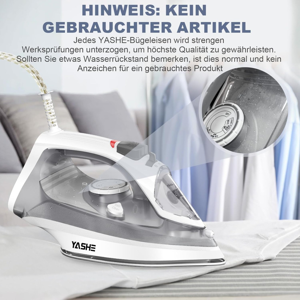 A YASHE gőzvasaló minden egyes darabja szigorú minőségellenőrzésen megy keresztül az üzemben, mielőtt elhagyná azt. Ez garantálja a legmagasabb szintű megbízhatóságot és teljesítményt. Az esetleges vízmaradék az eszközben teljesen normális és a funkcionális teszt jele – ez nem használt termék. A 12 hónapos garancia és a 24 órás ügyfélszolgálat biztosítja, hogy mindig támogatást kapsz, ha szükséged van rá.