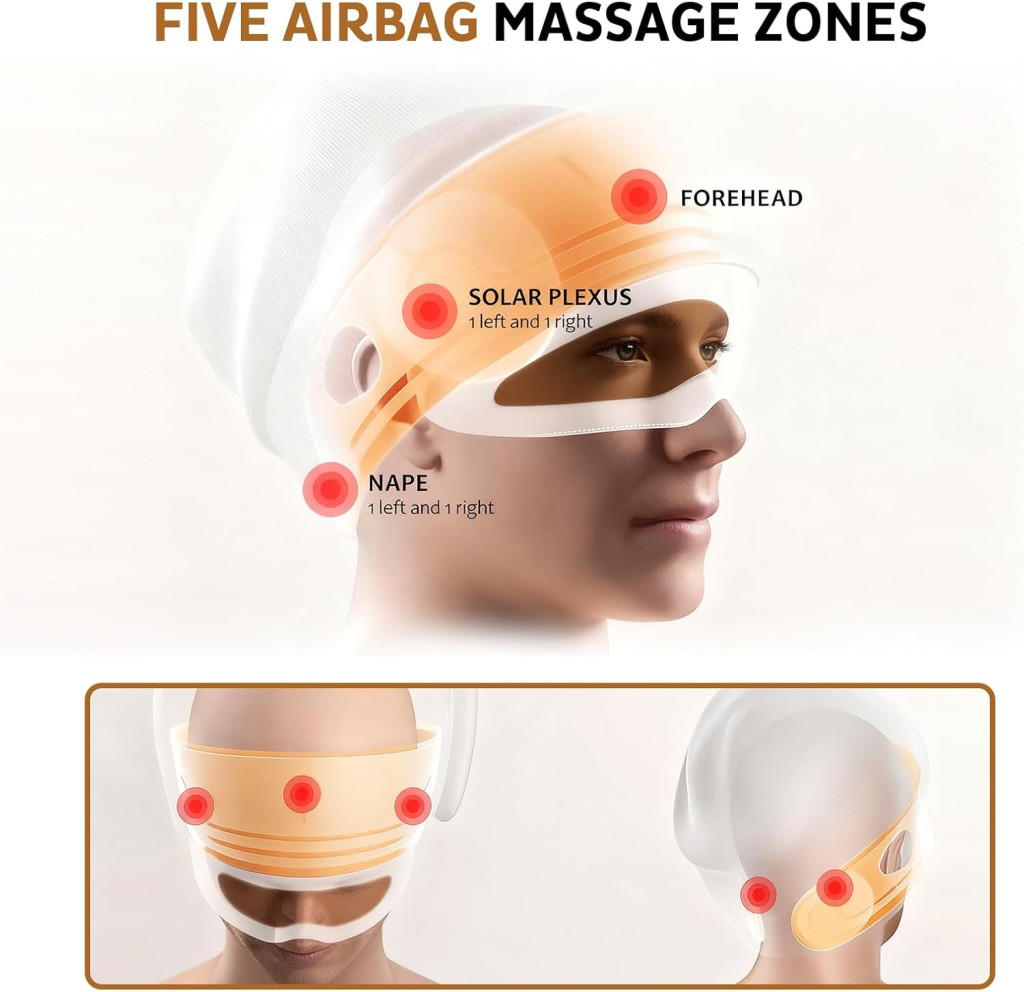 • Cinci zone de masaj cu airbag-uri: Airbag-urile amplasate pe frunte, tâmplele stângă și dreaptă, precum și pe zona gâtului, imită efectul masajului cu degetele