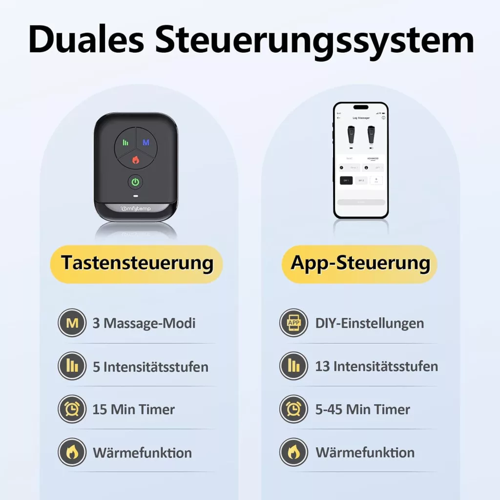 A masszázsgép két vezérlési módot kínál a maximális rugalmasság érdekében. A fizikai gombokkal gyors és egyszerű beállítások végezhetők, míg az okostelefon alkalmazáson keresztül részletesebb testreszabás lehetséges. Az alkalmazás segítségével 13 szintű intenzitást állíthat be mindhárom légpárnához külön-külön, így teljesen személyre szabott masszázs élményt hozhat létre.
