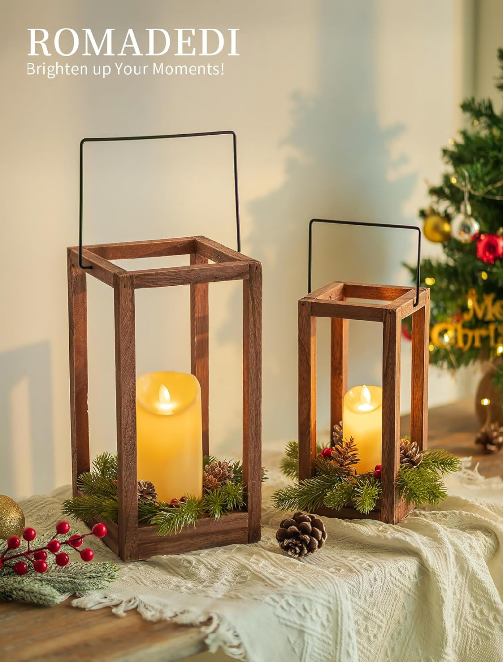 Setul de lămpi din lemn Romadedi este un adevărat deliciu festiv, care aduce o lumină caldă și elegantă în casa dumneavoastră. Acest set de două piese (30 cm și 24 cm) este realizat în stil rustic și include lumânări pillar LED reale, care sunt înconjurate de ghirlande de Crăciun detașabile. Ghirlandele sunt decorate cu fructe de pădure roșii vibrante, conuri naturale și ramuri de brad, creând o atmosferă autentic festivă.