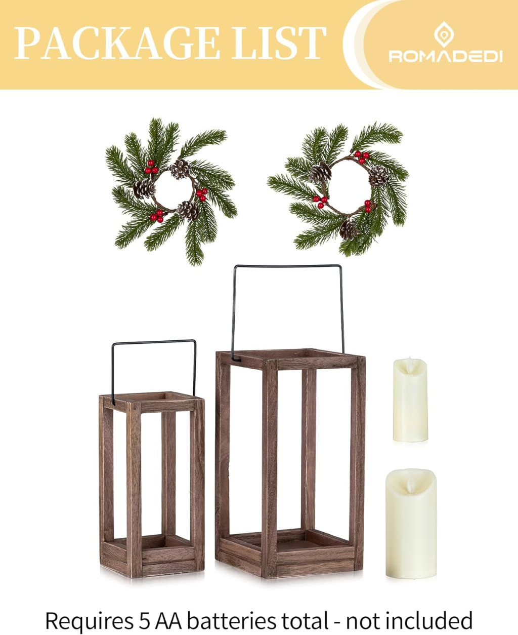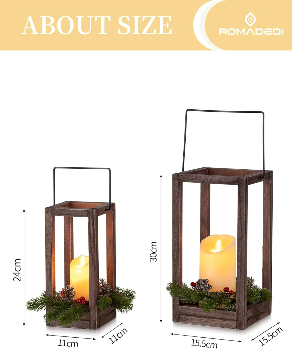 - Set de două piese: Lămpi din lemn de 30 cm și 24 cm înălțime, fiecare cu propria lumânare LED și ghirlandă de Crăciun