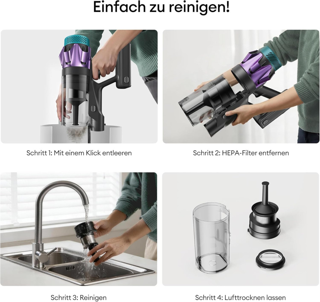 Az Ultenic porszívó karbantartása egyszerű és költséghatékony. A HEPA szűrőt rendszeresen tisztítani kell, hogy megőrizze a szívóerőt. Az anti-tangle kefe könnyen tisztítható, és az 1,6 literes porgyűjtő tartály gyorsan üríthetõ. A falra szerelhető töltőállomás biztosítja, hogy a porszívó mindig készen áll a használatra, és nem foglal el helyet a szobában.