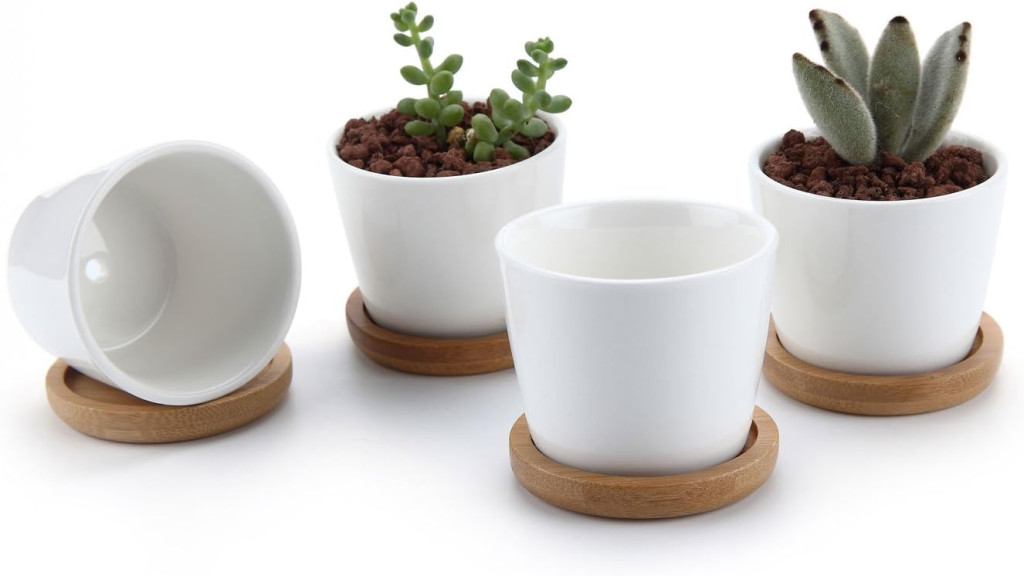 A T4U szukkulens ültetőedény egy elegáns és praktikus megoldás azoknak, akik szeretik a növényeket és a modern asztali dekorációt. Ez a 4 darabos kerámia cserépkészlet tökéletes választás szukkulensekhez, kaktuszokhoz és egyéb kisebb növényekhez. A fehér kerámia anyag modern stílusú, amely bármely lakberendezéshez harmonikusan illeszkedik. Az alján található lyuk biztosítja a megfelelő vízlevezetést, így a növények egészségesek maradnak. A bambusz alátét nemcsak praktikus, hanem esztétikus megoldást is nyújt az asztal védelméhez.