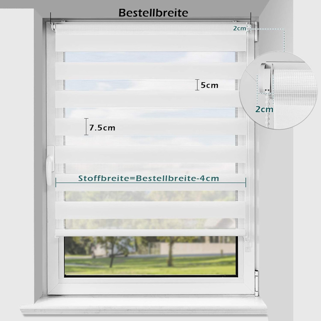Méretezési útmutató: A szövet szélessége körülbelül 4 cm-rel keskenyebb a teljes szélességnél. Rendelési szélesség = ablaküveg szélessége + 4-5 cm. A magasság az egész ablakkeret magasságával egyezzen meg. Például: 74 cm széles ablakhoz 80 cm széles redőny ajánlott.