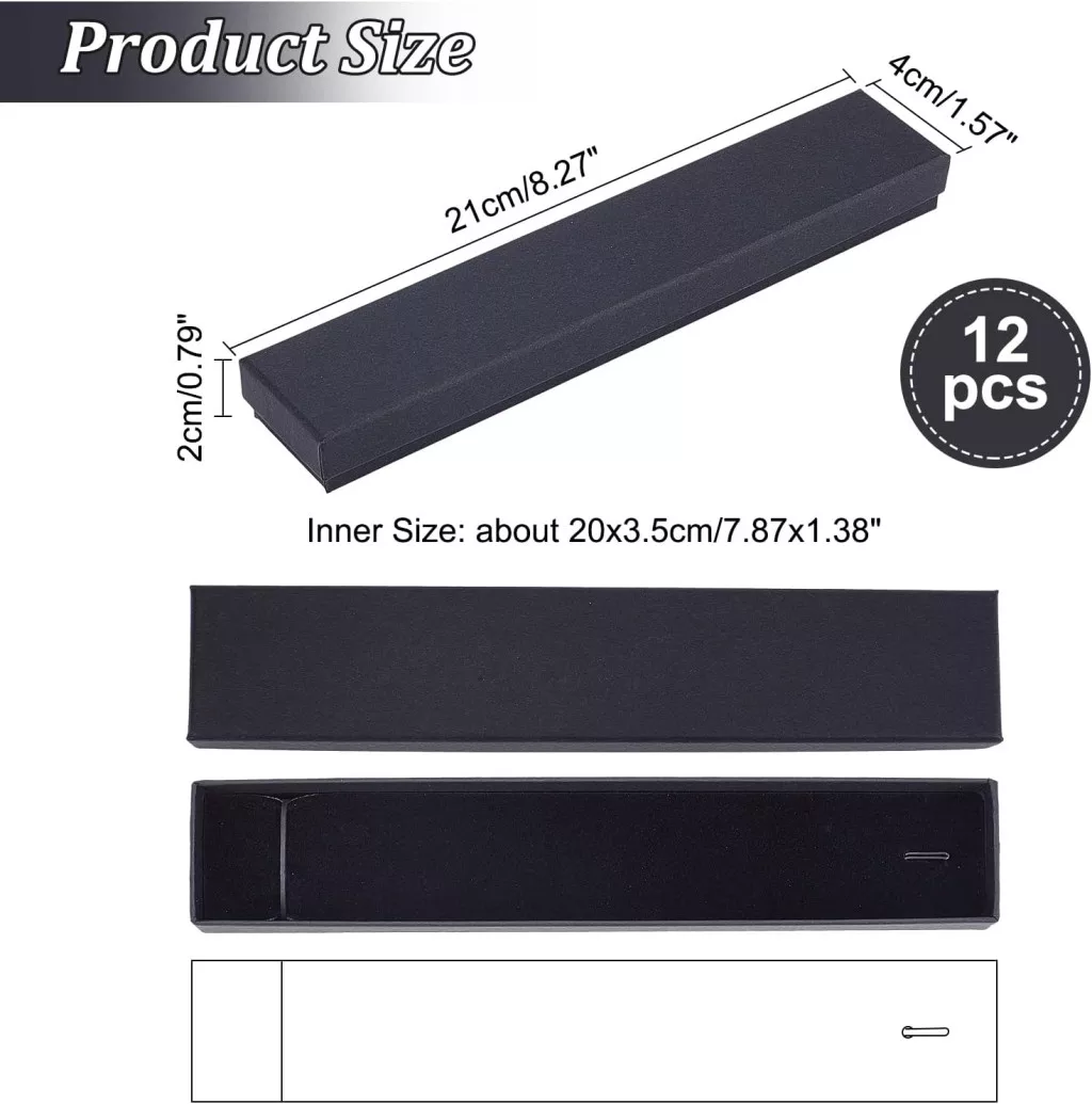 Táto vysoko kvalitná 12-dielna súprava čiernych kartónových krabičiek na šperky je ideálnou voľbou pre každého milovníka šperkov. Krabičky od značky nbeads poskytujú elegantný vzhľad na uloženie náhrdelníkov, náramkov a iných drobných šperkov. Rozmery 21 x 4 x 2 cm sú ideálne pre väčšinu typov náhrdelníkov, zatiaľ čo vnútorná penová ochrana chráni cenné kúsky pred poškriabaním.
