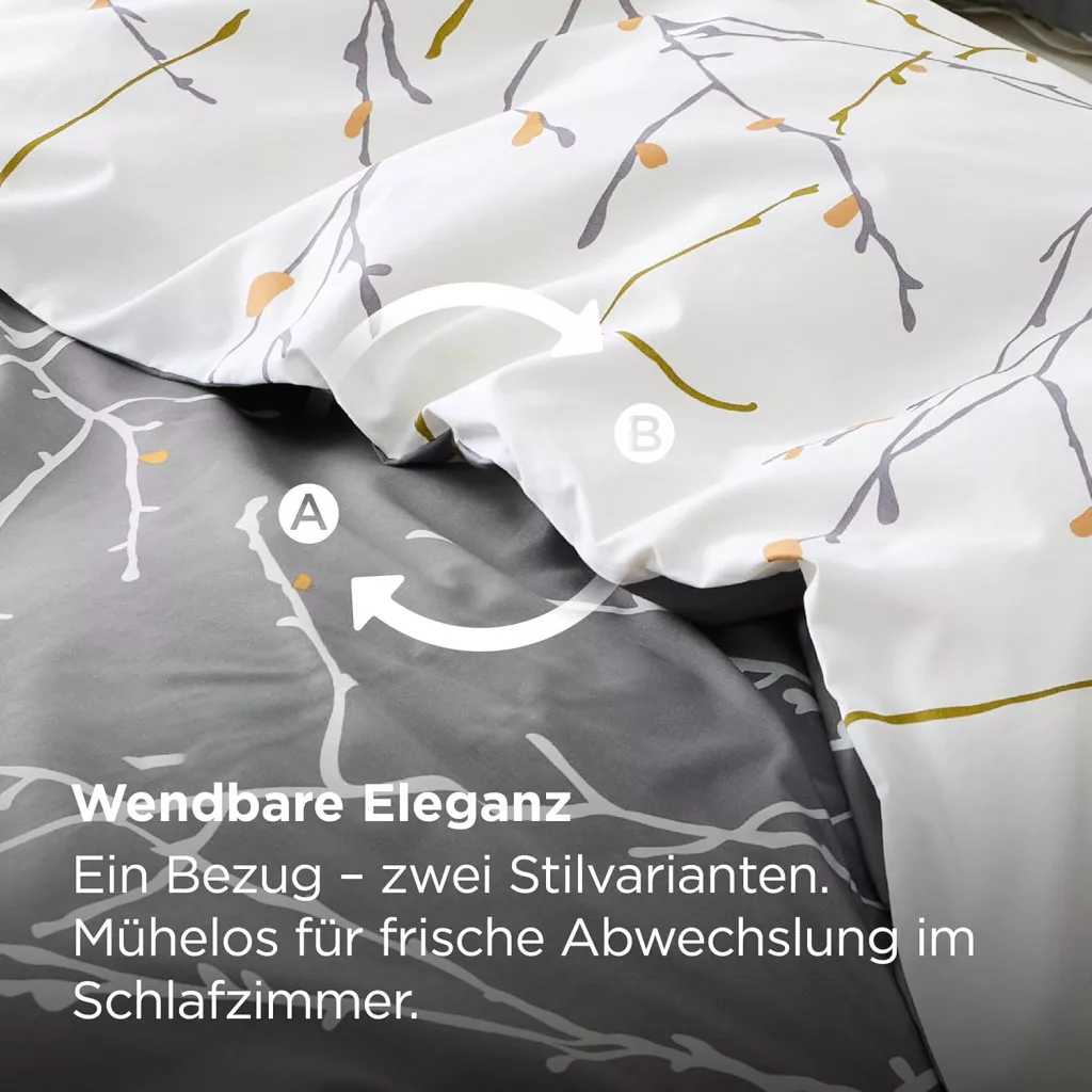 Elegantný vzor konárov v obojstrannom sivom a béžovom odtieni ponúka moderný, vycibrený vzhľad. Súprava obsahuje jednu obliečku na prikrývku 155 x 220 cm a dve obliečky na vankúš 80 x 80 cm, čo predstavuje kompletné riešenie pre vašu posteľ.