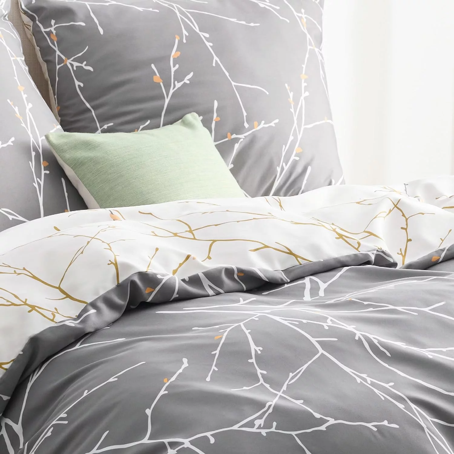 Súprava obliečok Bedsure 155 x 220 cm z mikrovlákna predstavuje dokonalú kombináciu elegancie a pohodlia. Táto 3-dielna súprava obsahuje jednu veľkú obliečku na prikrývku a dva obliečky na vankúš, zdobené vzorom sivých konárov. Prémiový materiál z mikrovlákna zaručuje mäkkosť, priedušnosť a jednoduchú údržbu, vďaka čomu je ideálnou voľbou pre jednolôžkové postele.