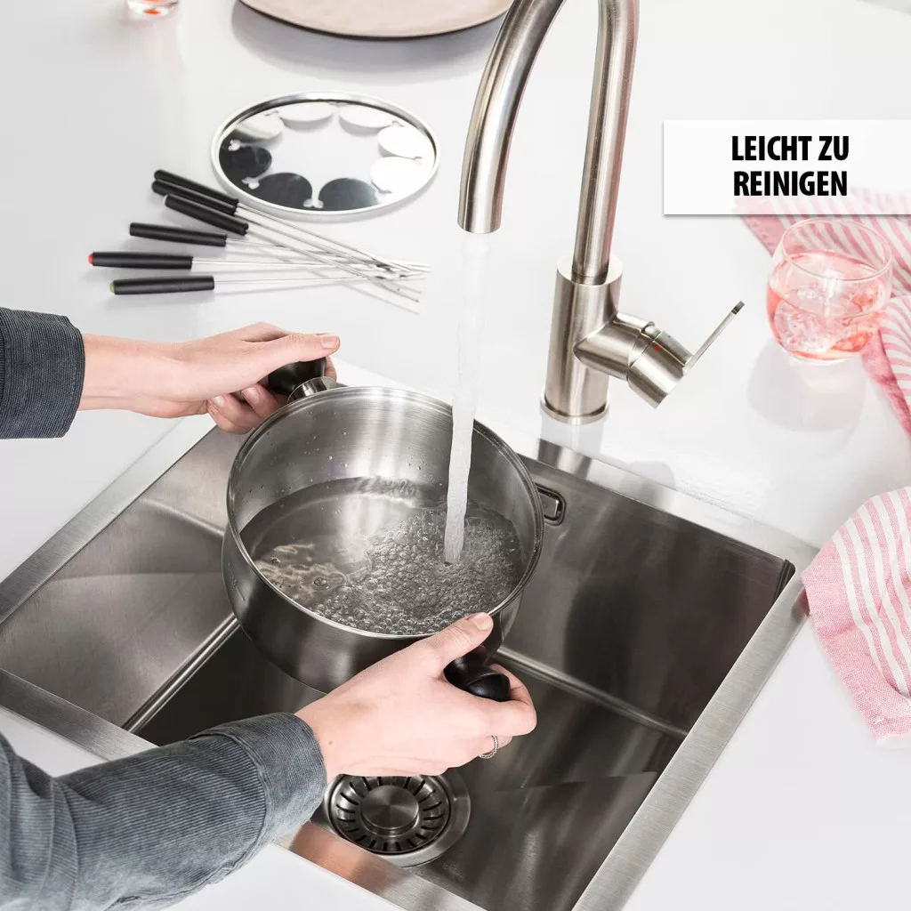 A rozsdamentes acél anyag garantálja a hosszú élettartamot, míg a cool-touch fogantyúk és a szoknya a biztonságot. Az eltávolítható alkatrészek mosogatógépben tisztíthatók, így az utána takarítás egyszerű és gyors. Az 1,3 literes kapacitás elegendő 8 személy számára, és a szószmártogatási gyűrű praktikus tárolást biztosít a különféle szószoknak.