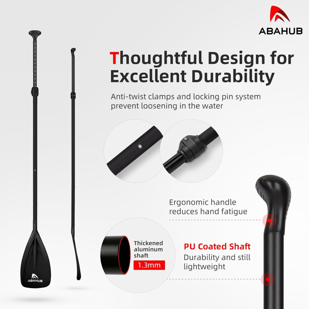 Abahub SUP pádl je vysokokvalitné 3-dielne pádlo, ktoré predstavuje perfektnú voľbu pre začiatočníkov, hobby nadšencov aj profesionálnych paddleboardistov. Produkt je možné plynulo nastaviť v rozmedzí od 68 do 84 palcov, vďaka čomu sa prispôsobí takmer každej výške postavy a štýlu pádlovania. Hriadeľ vyrobený z hliníkovej zliatiny a vystužený polypropylénový list zaručujú dlhú životnosť a spoľahlivý výkon v sladkej aj slanej vode.