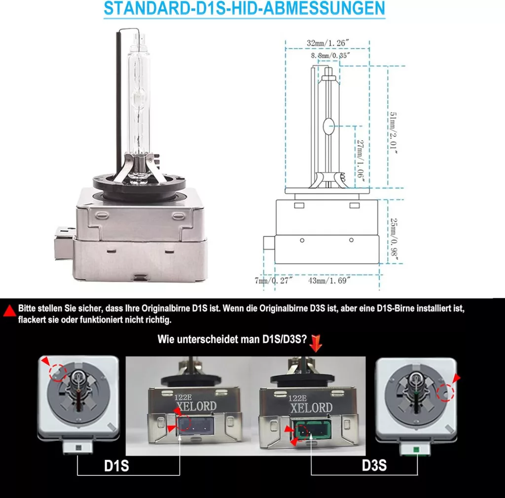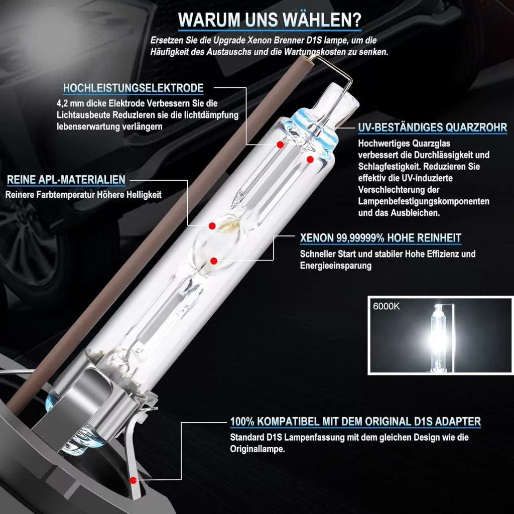 Az izzó megakadályozza a meghibásodásokat és a villogást, valamint másodpercek alatt indul. Teljesen kompatibilis a legtöbb D1S xenon fényszóróval felszerelt járművel, beleértve a BMW, Audi, Mercedes-Benz, Volkswagen és más prémium márkákat.