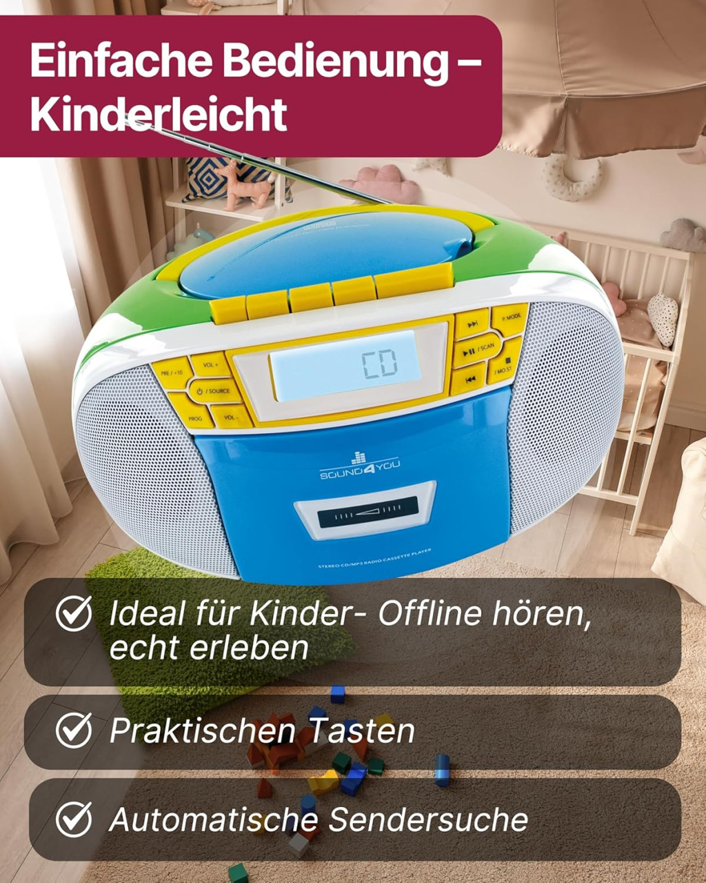 • CD, kazeta, MP3, USB a FM rádio v jednom zariadení