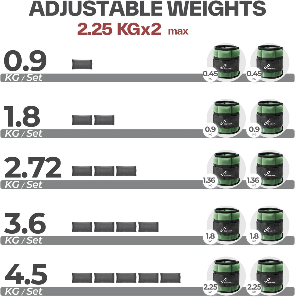 A Sportneer bokasúlyok egy sokoldalú edzésfelszerelés, amely tökéletesen alkalmas kezdőktől a haladó sportolókig. Ez a páros szett két bokasúly-mandzsettát tartalmaz, amelyek egyenként 0,45 kg-tól 2,25 kg-ig állíthatók, így összesen 0,9 kg-tól 4,5 kg-ig terjedő súlyozás érhető el. Az öt darab, egyenként 0,45 kg-os súlyzacskó lehetővé teszi a fokozatos súlyemelést, amely ideális a progresszív edzésprogramokhoz.