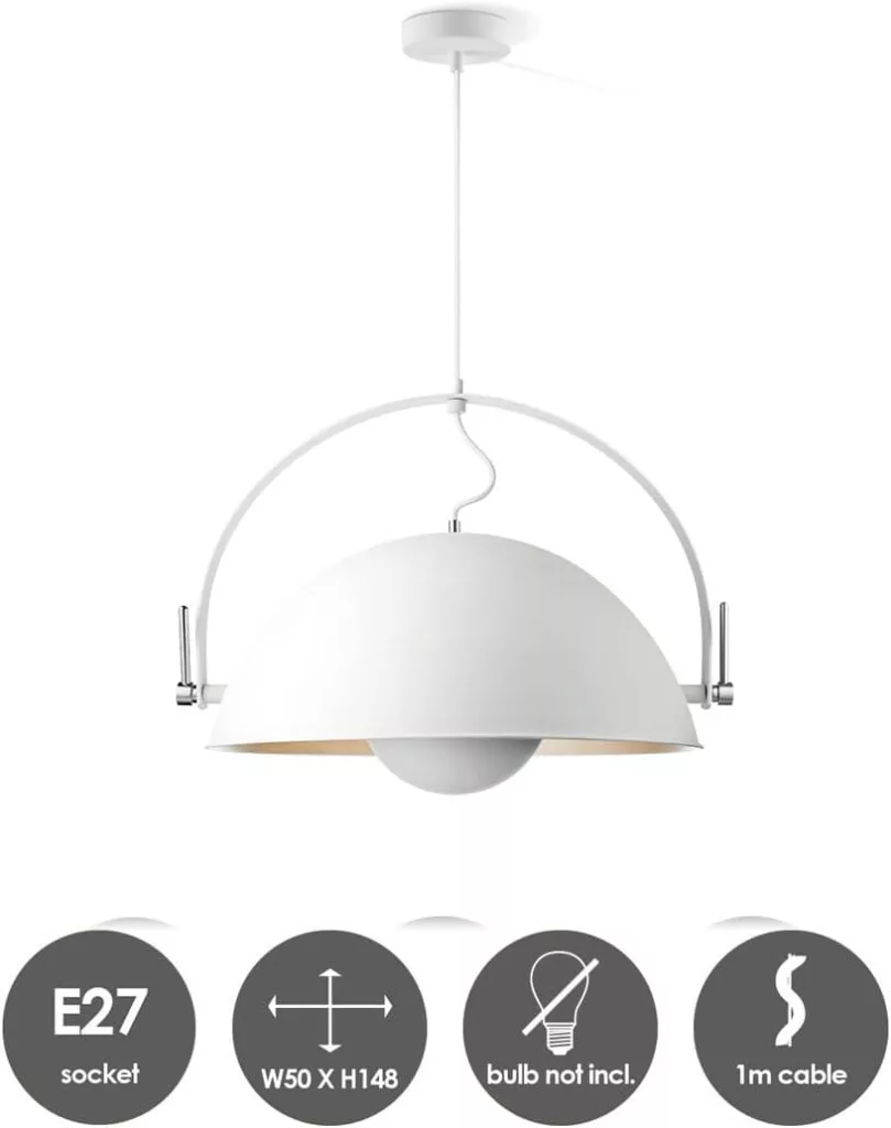 A Home Sweet Home Fabriq Bow függőlámpa az ideális választás azok számára, akik modern, elegáns és funkcionális világítási megoldást keresnek. Az E27 LED-es foglalat energiahatékony megoldást biztosít, amely csökkenti az elektromosság fogyasztást és hosszú élettartamot garantál. A matt fehér felület és az ezüst belső reflexió meleg, barátságos fényt teremt, amely tökéletes a pihenéshez és relaxációhoz.