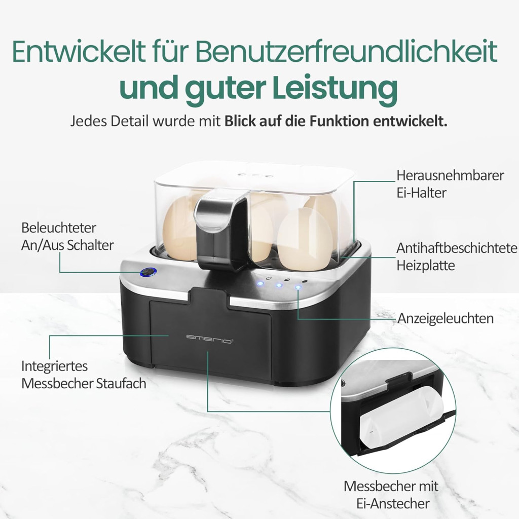 A svájci dizájn és a német hangkimenet kombinációja ezt a terméket igazán különlegessé teszi. Az EMERIO márkáról ismert, hogy kiváló minőségű elektromos készülékeket kínál ésszerű áron. Ez a tojásfőző pedig a 2021-es év terméke lett, amit a szakmai konyhai és háztartási magazin ítélt oda.