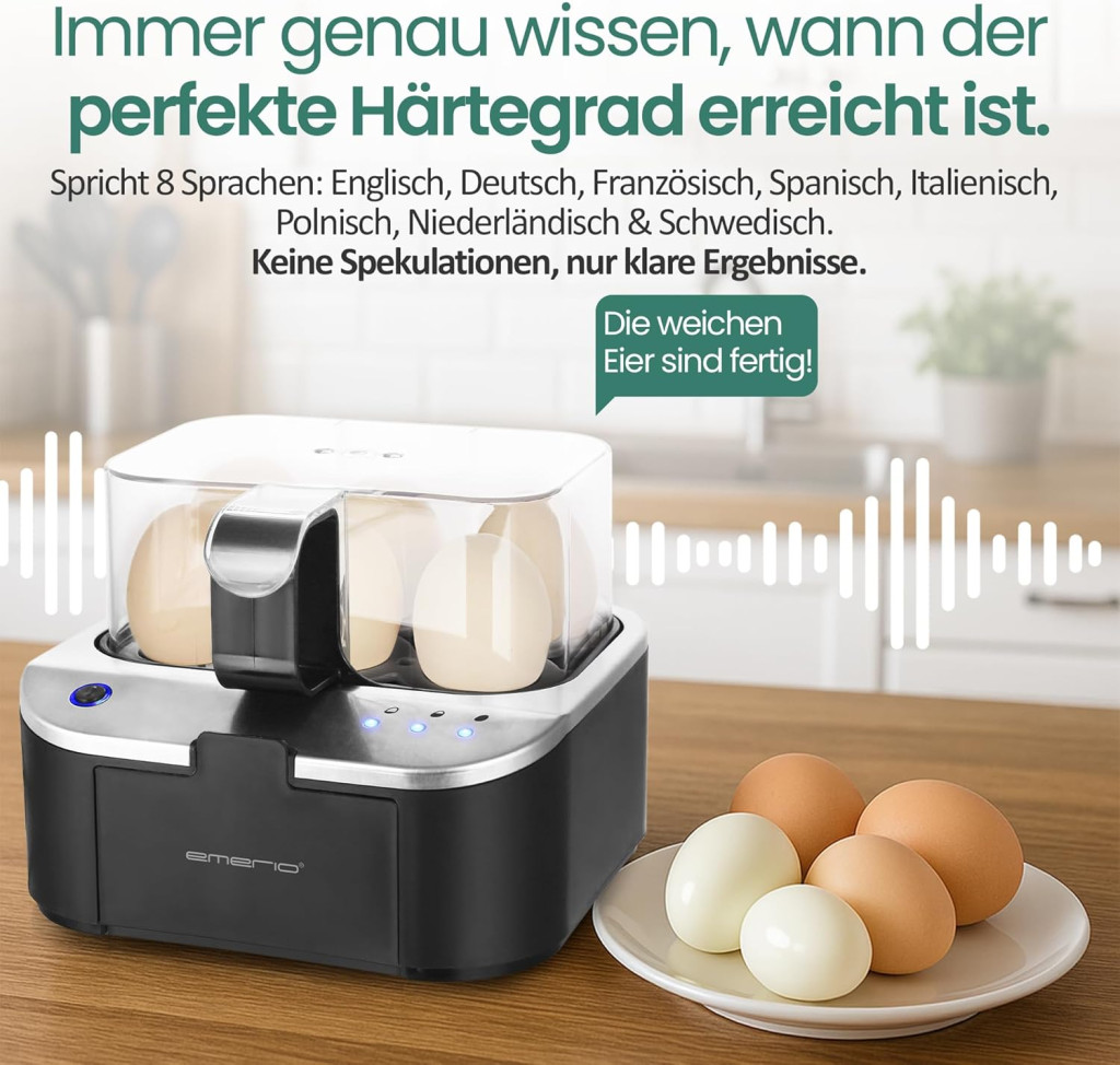 EMERIO Tojásfőző beszéd funkcióval, puha-közepes-kemény főzés egy folyamatban, német hangkimenet, BPA-mentes